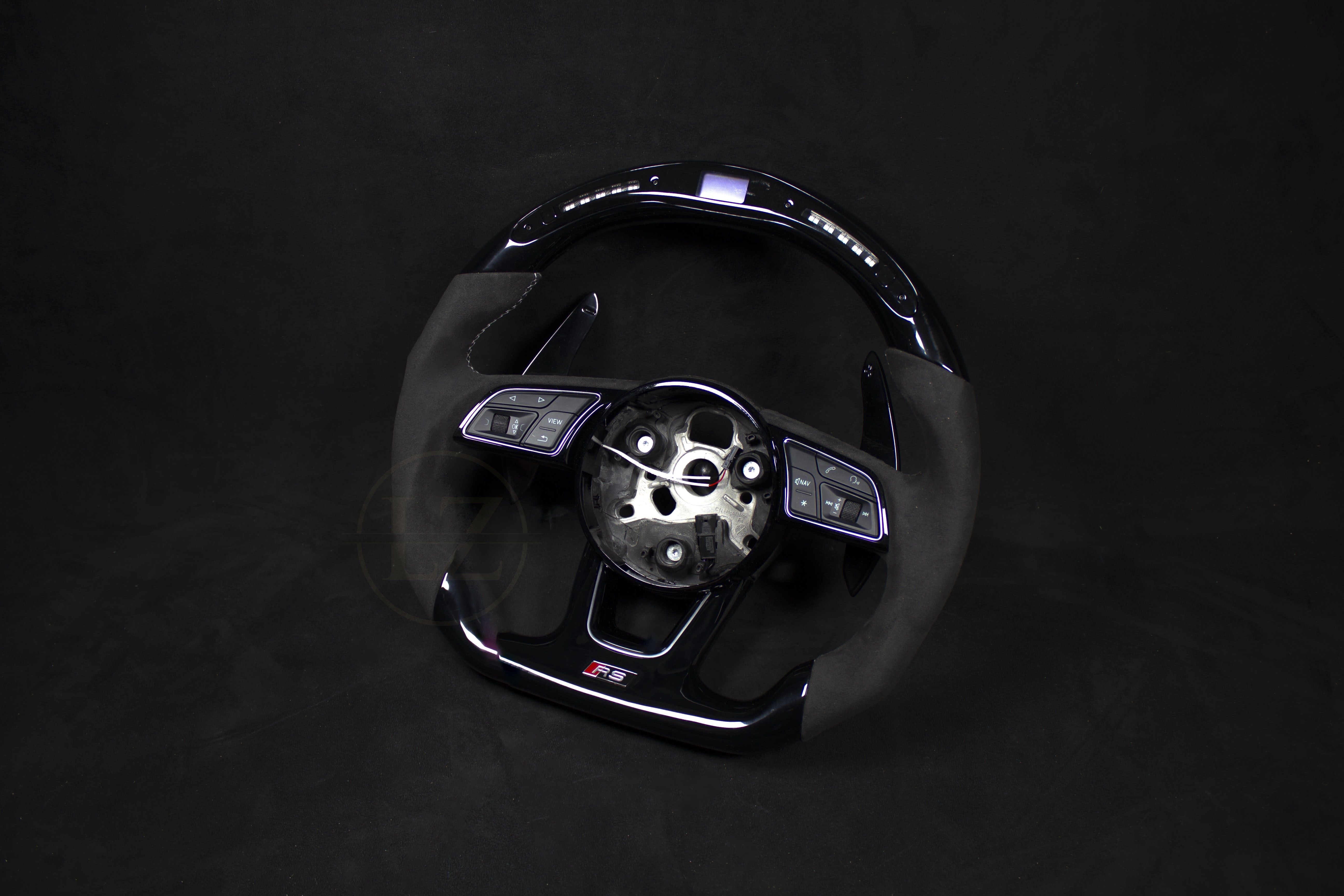 Spesifikasjoner inkluderer 9002 Alcantara på sidene, pianogloss topp og bunn, hvite sømmer, flat bunn, tykkere sider og LED. Rattet kan tilpasses med eller uten paddle hull, og leveres med eksisterende knapper og airbag for enkel installasjon.