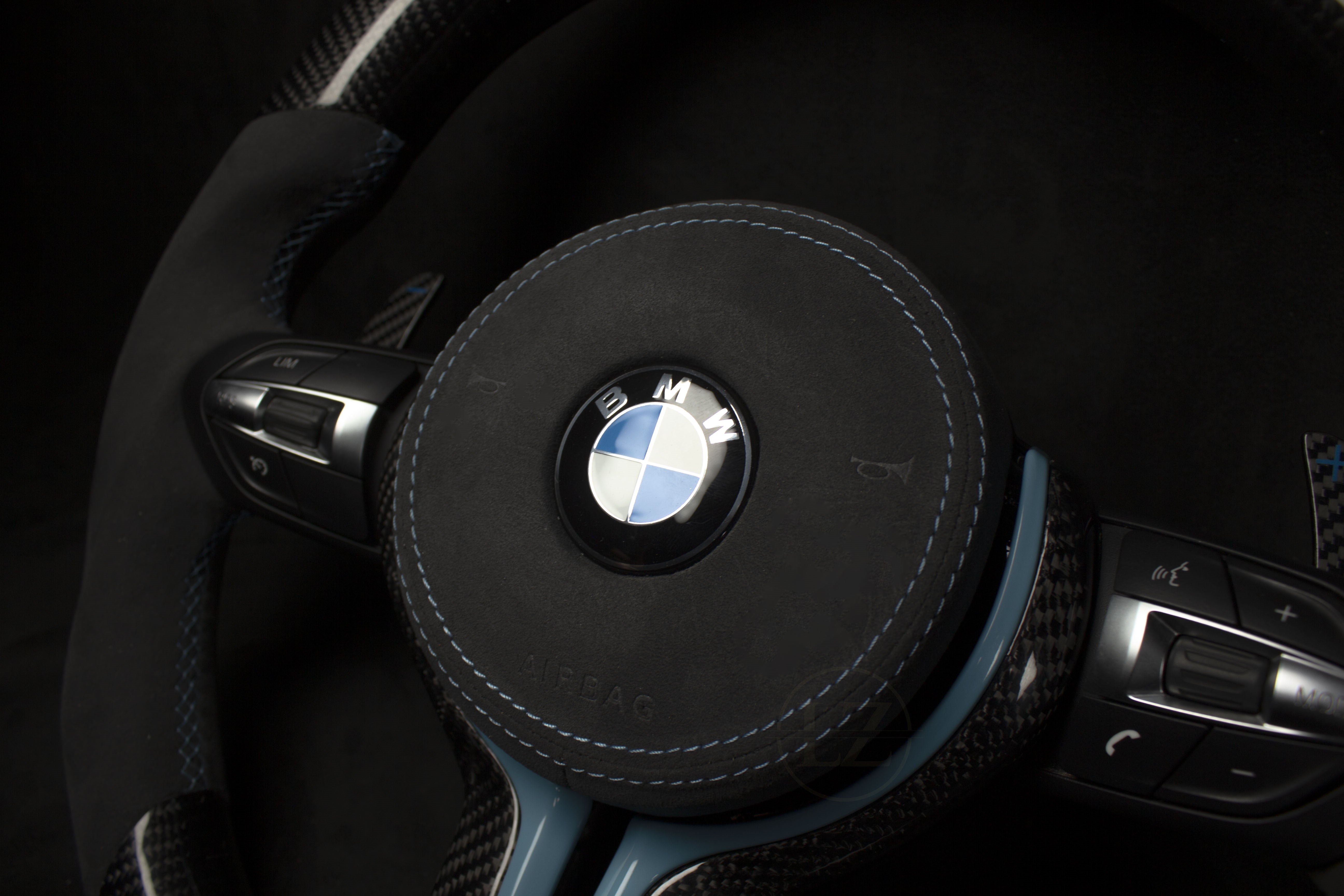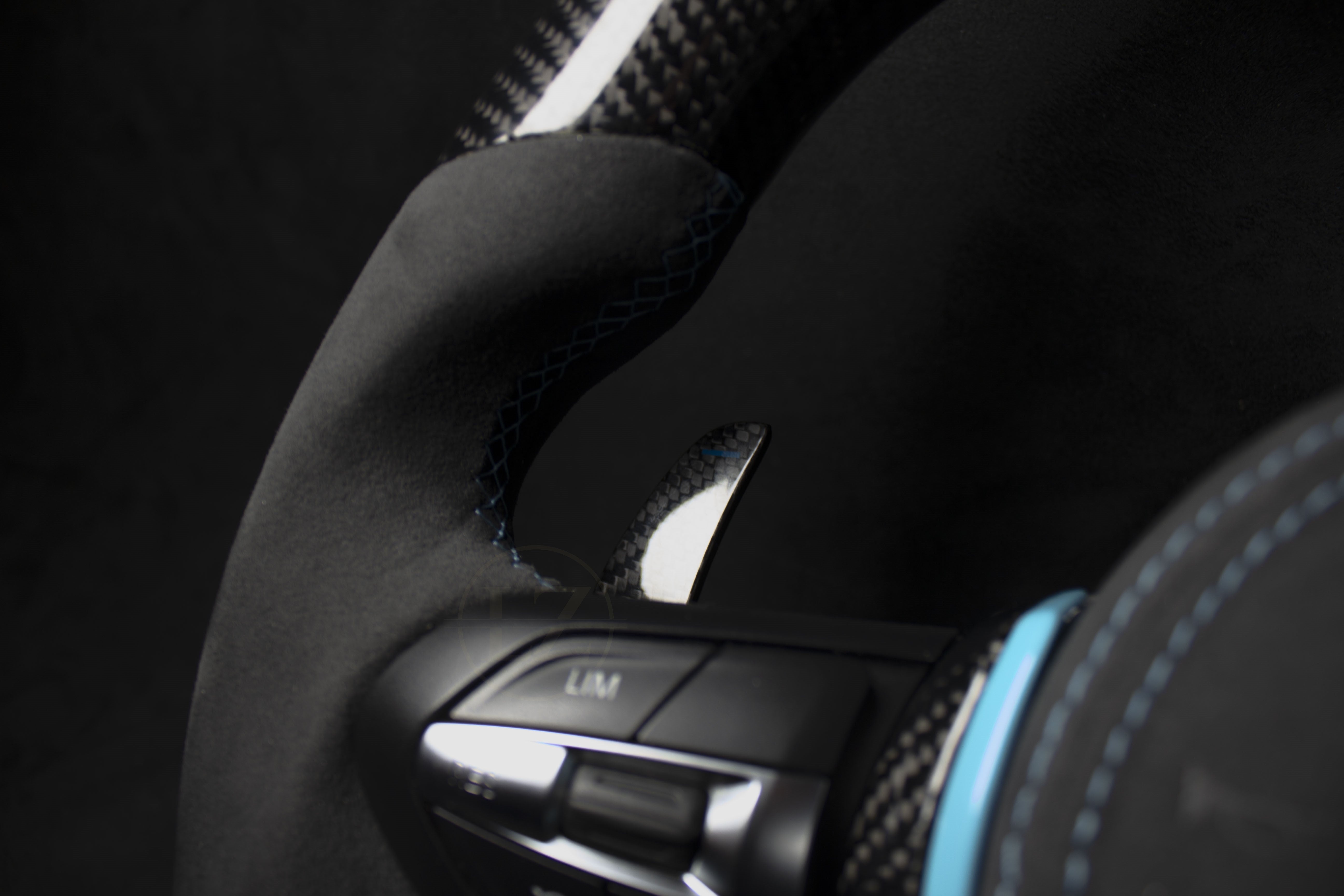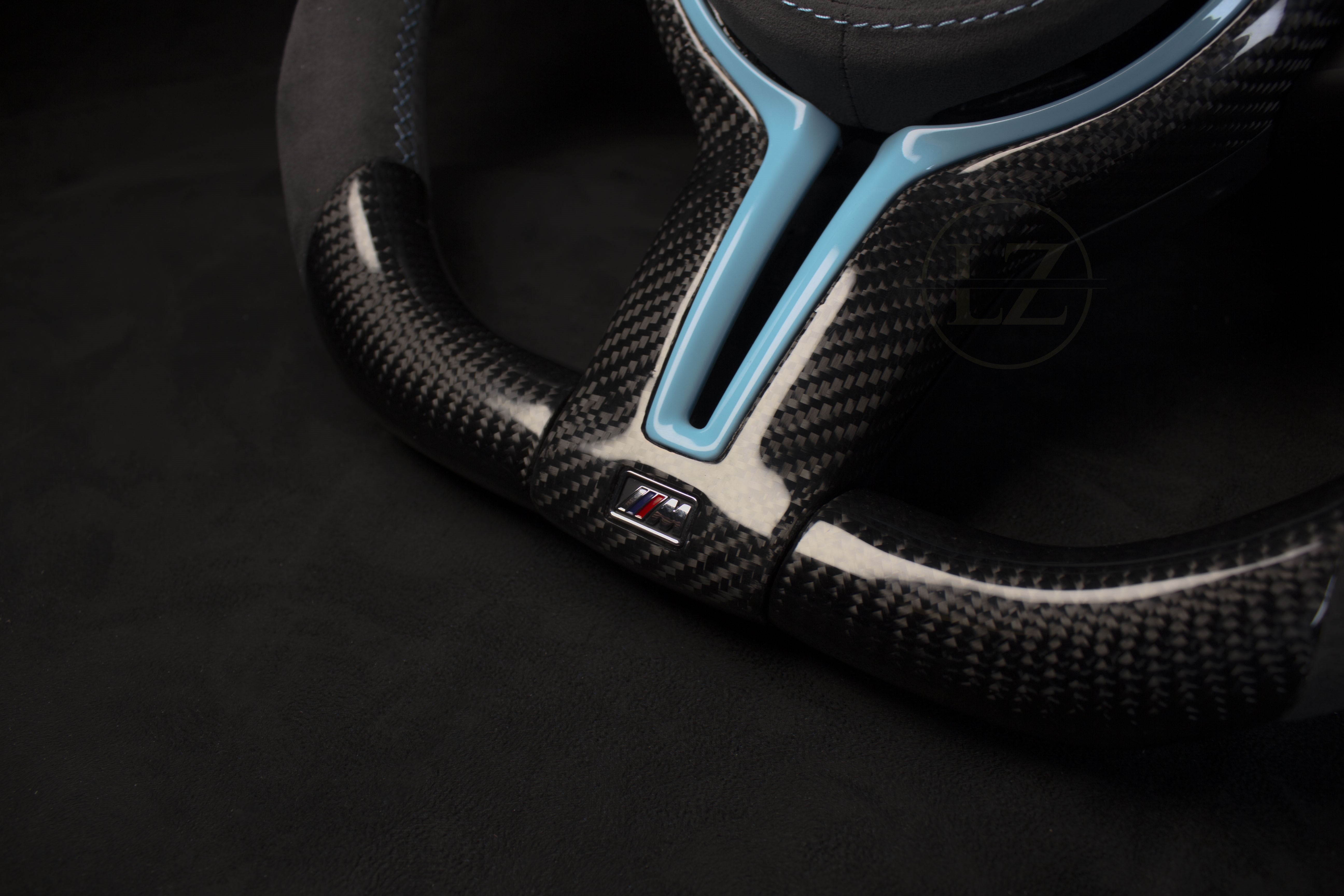 Oppdag det unike BMW F-Serie Alcantara/Carbon Rattet med LED Yas Marina Blå Detaljer, en perfekt kombinasjon av stil og funksjonalitet. Dette håndlagde rattet passer alle BMW F2X, 3X og 8X med M-Sport ratt, og gir en skreddersydd opplevelse.