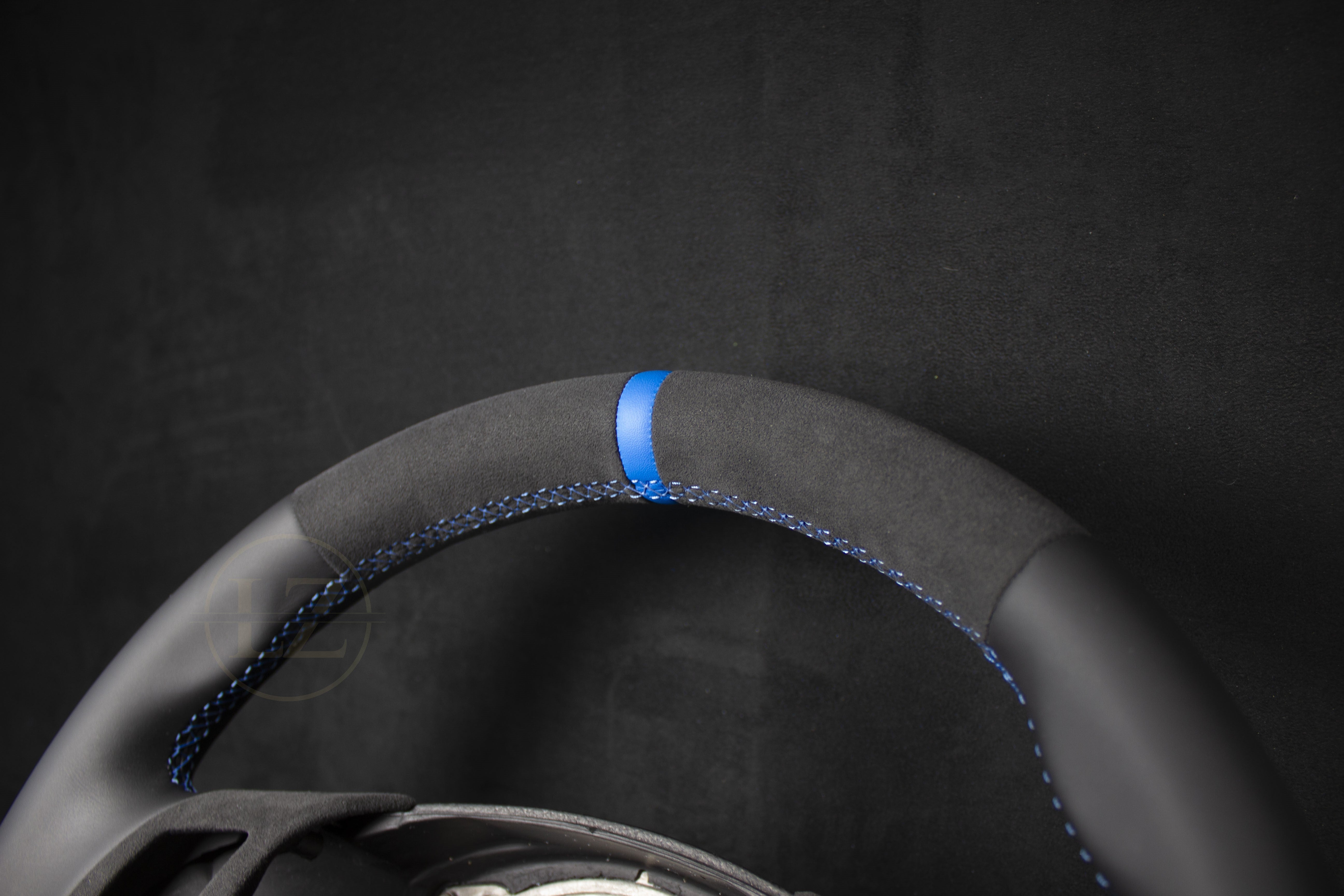 The steering wheel features specifications such as Alcantara on the top and bottom, Nappa leather on the sides, as well as a stylish blue stripe and stitching. Choose between Paddle Holes or Alcantara steering wheel cover for a customized experience.