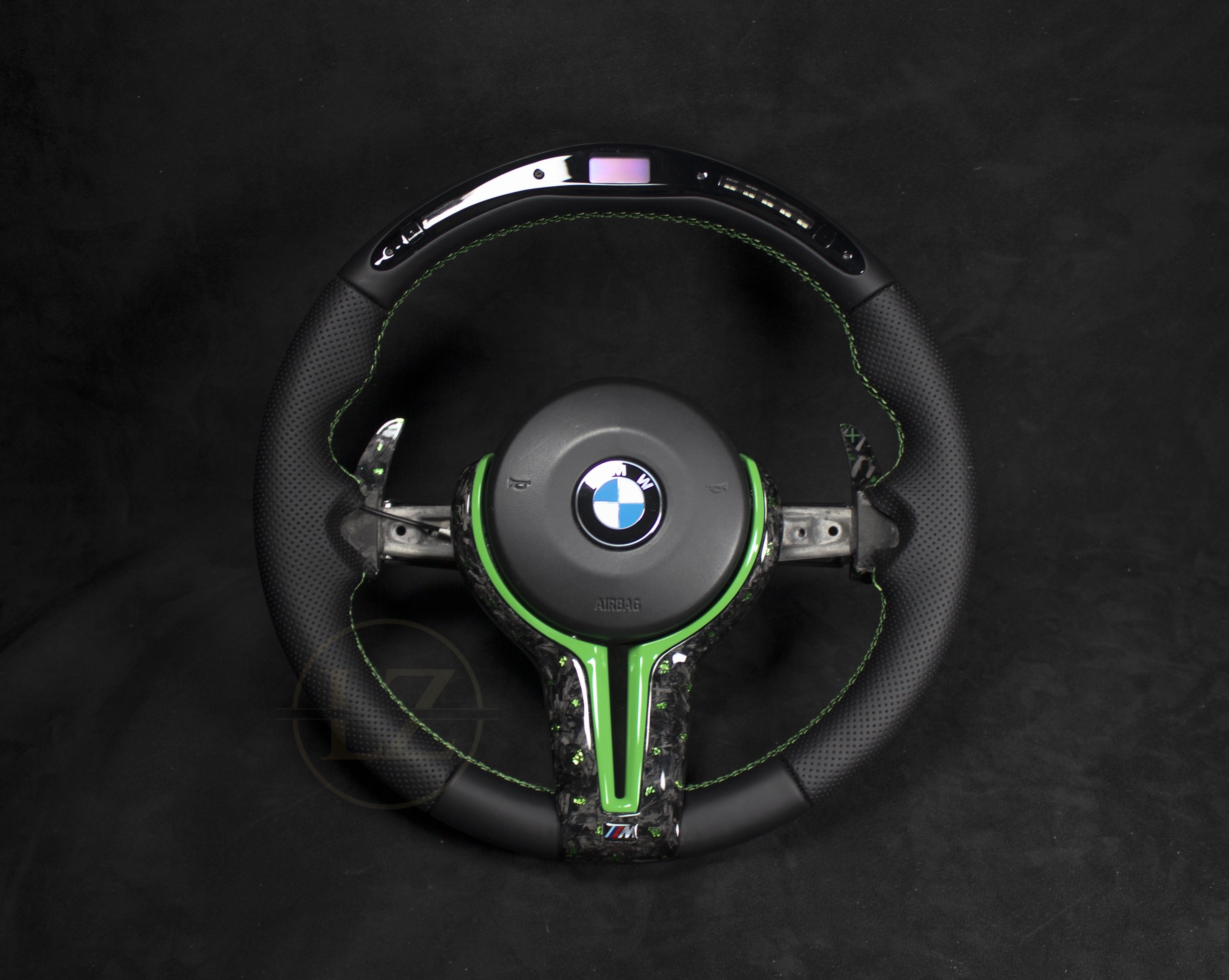 Discover the unique BMW F-Series LED Steering Wheel with leather and neon green details, designed to fit all BMW F2X, 3X, and 8X models with M-Sport steering wheels. This handcrafted steering wheel is perfected down to the smallest detail, providing exceptional quality and style.