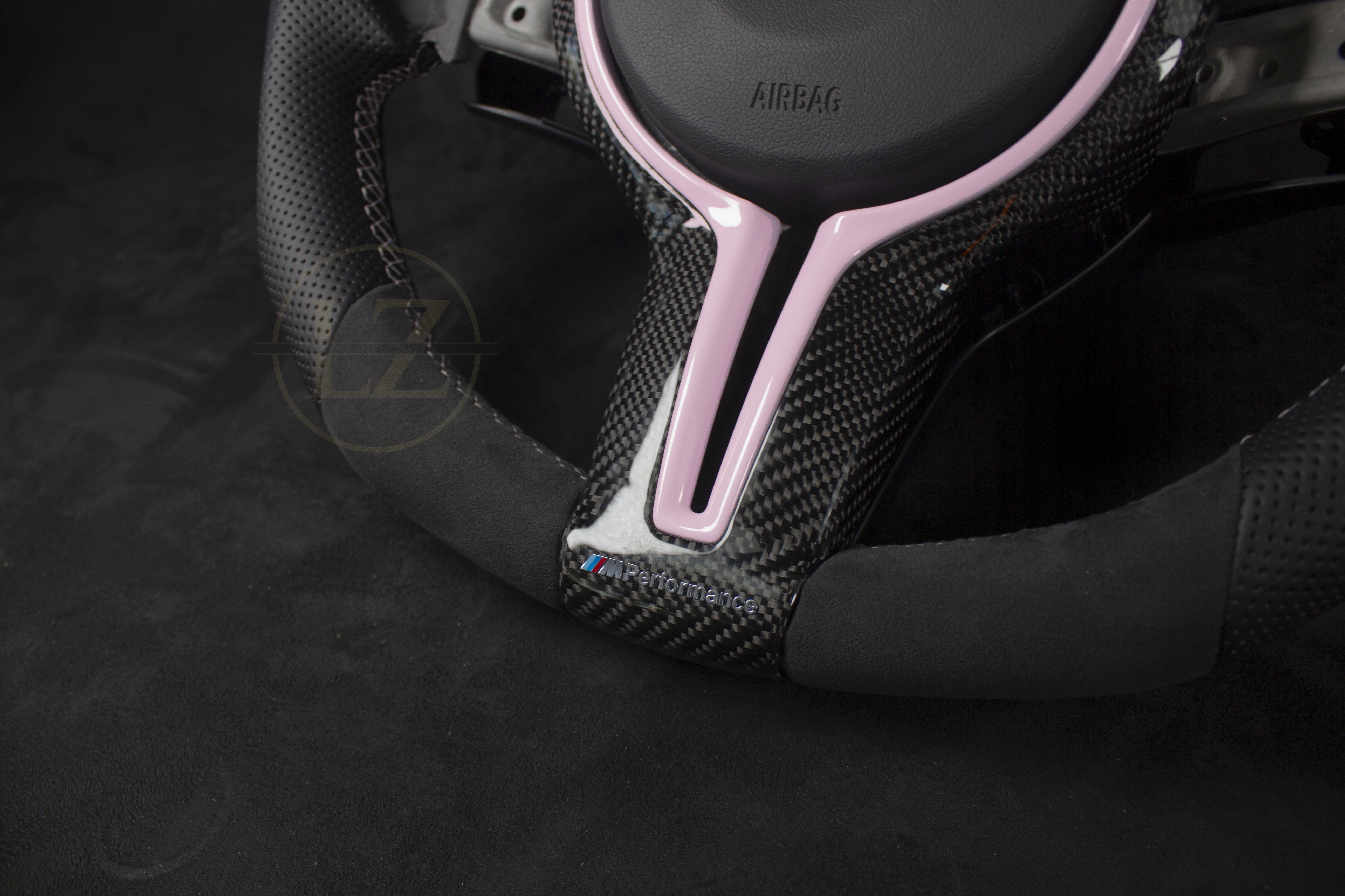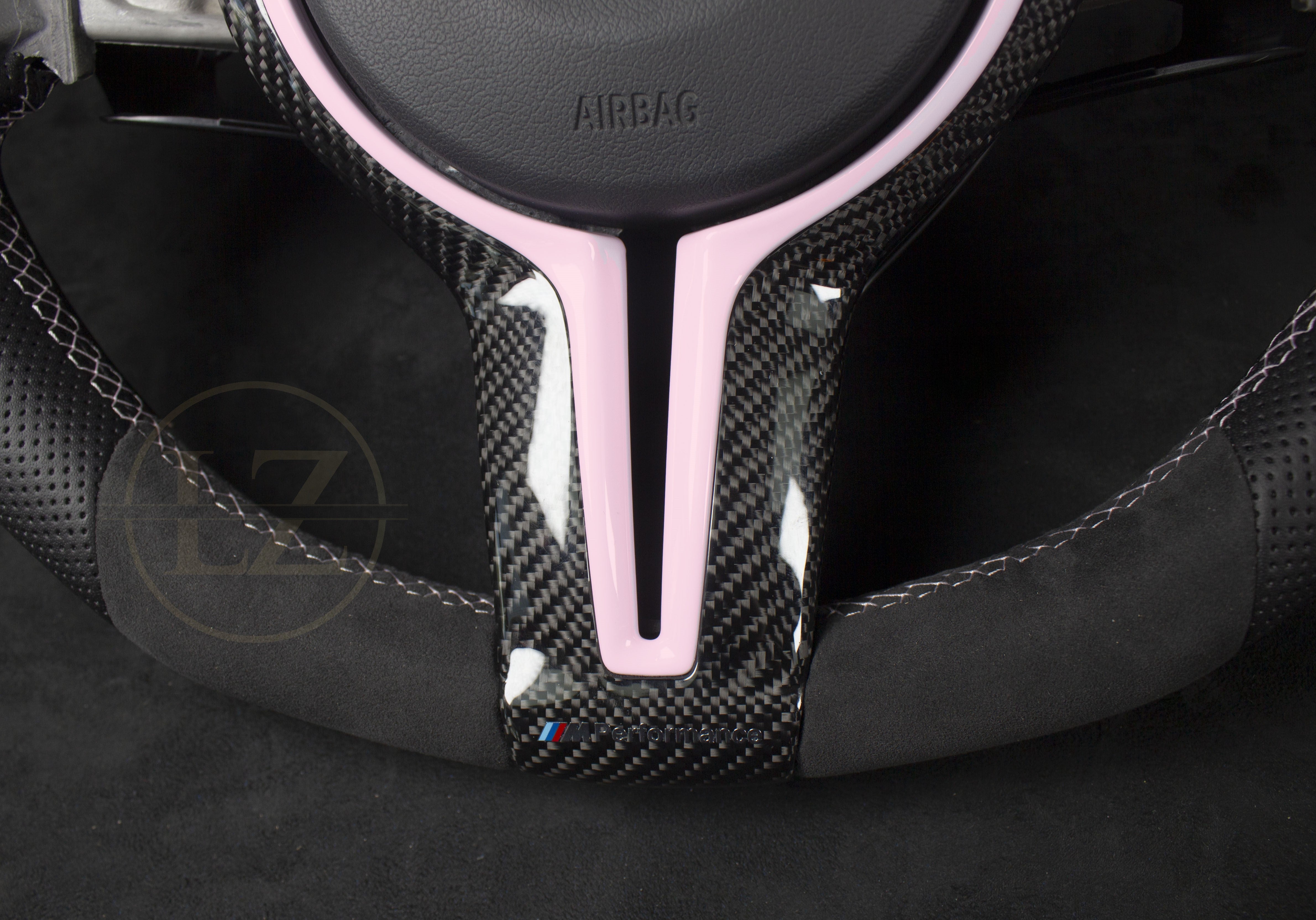 The wheel is made from genuine Alcantara and Nappa leather, combined with carbon from Japan for exceptional quality. With specifications such as ventilated leather, baby pink stitching, and a flat bottom, this steering wheel stands out in both style and functionality.