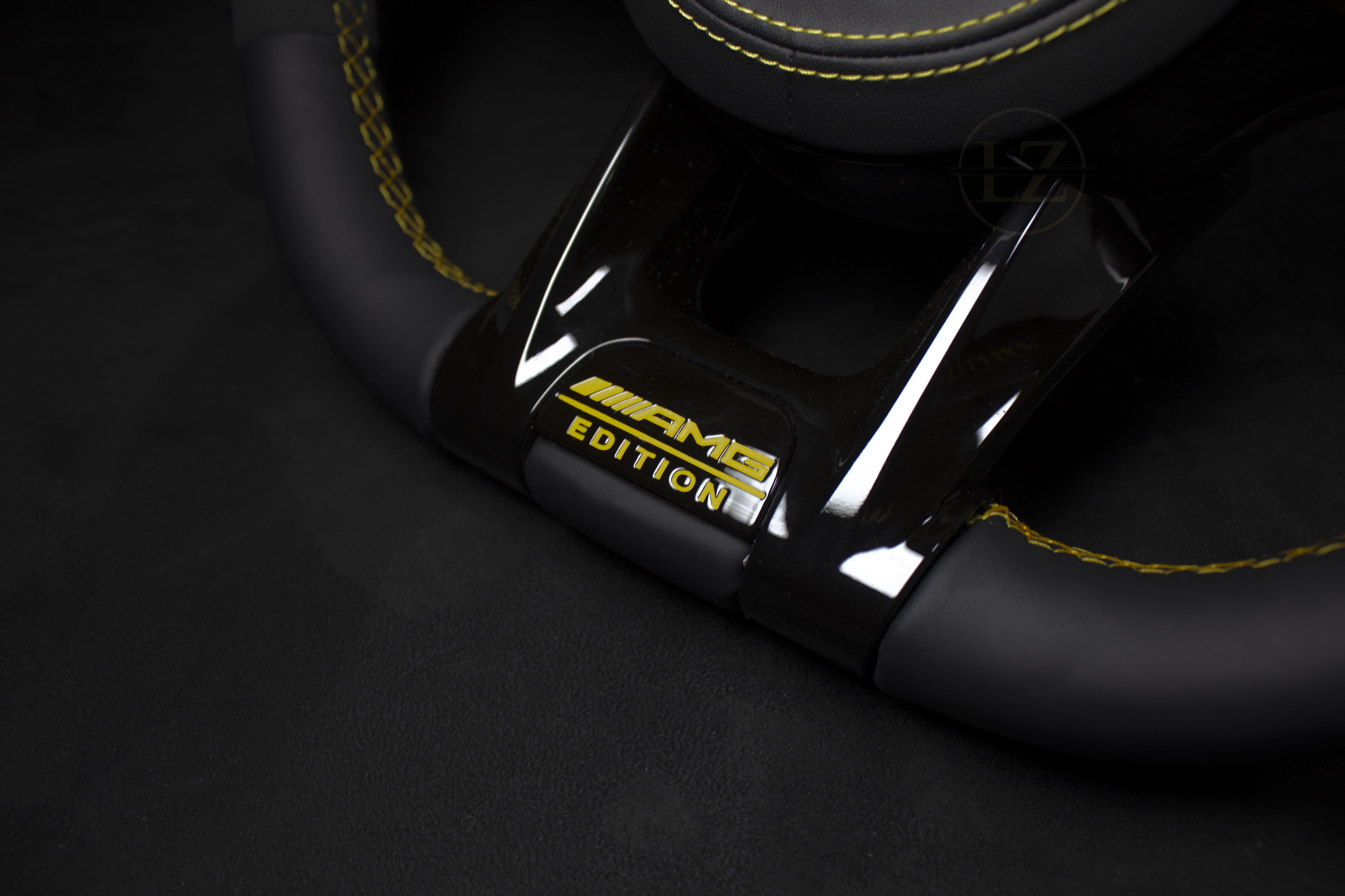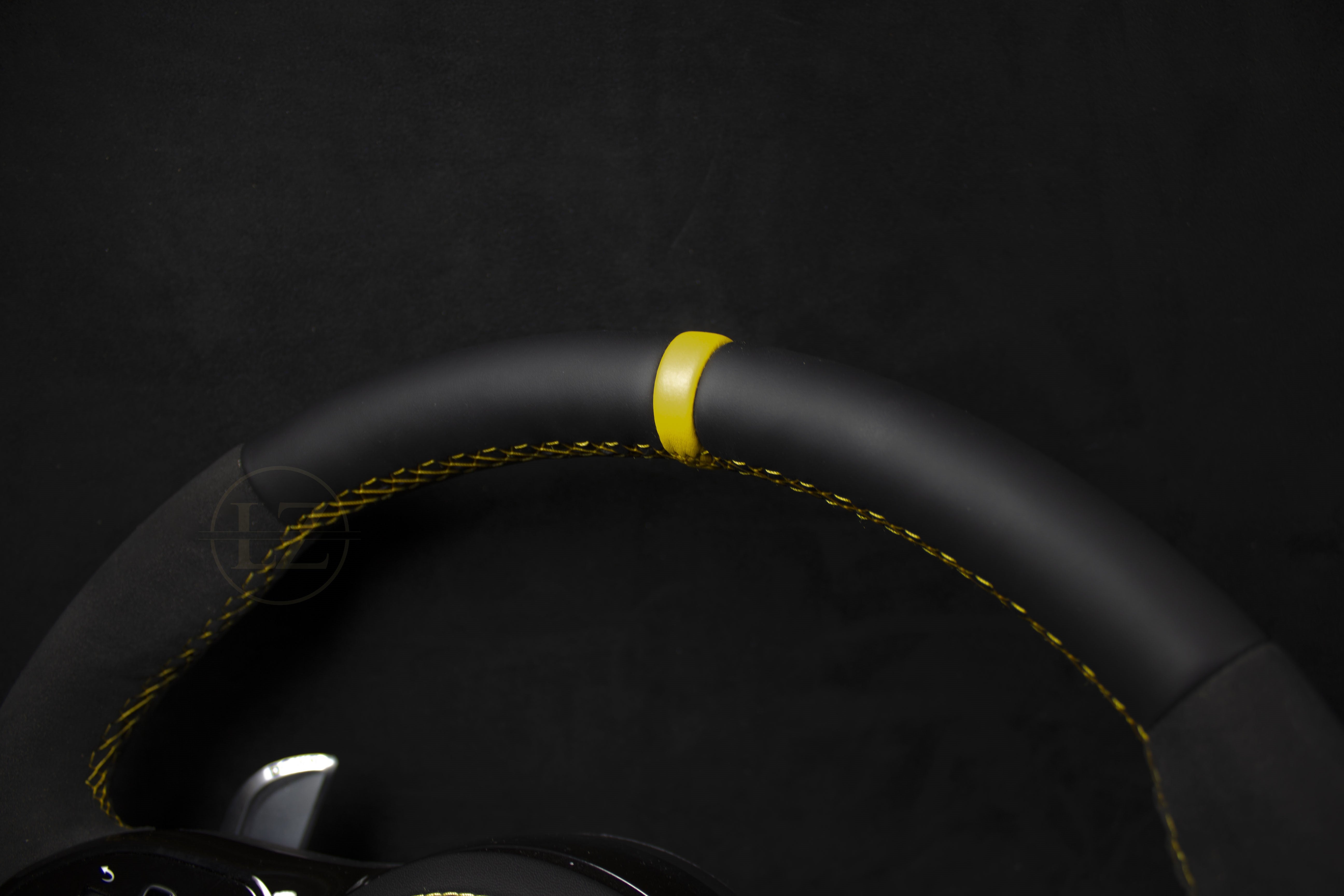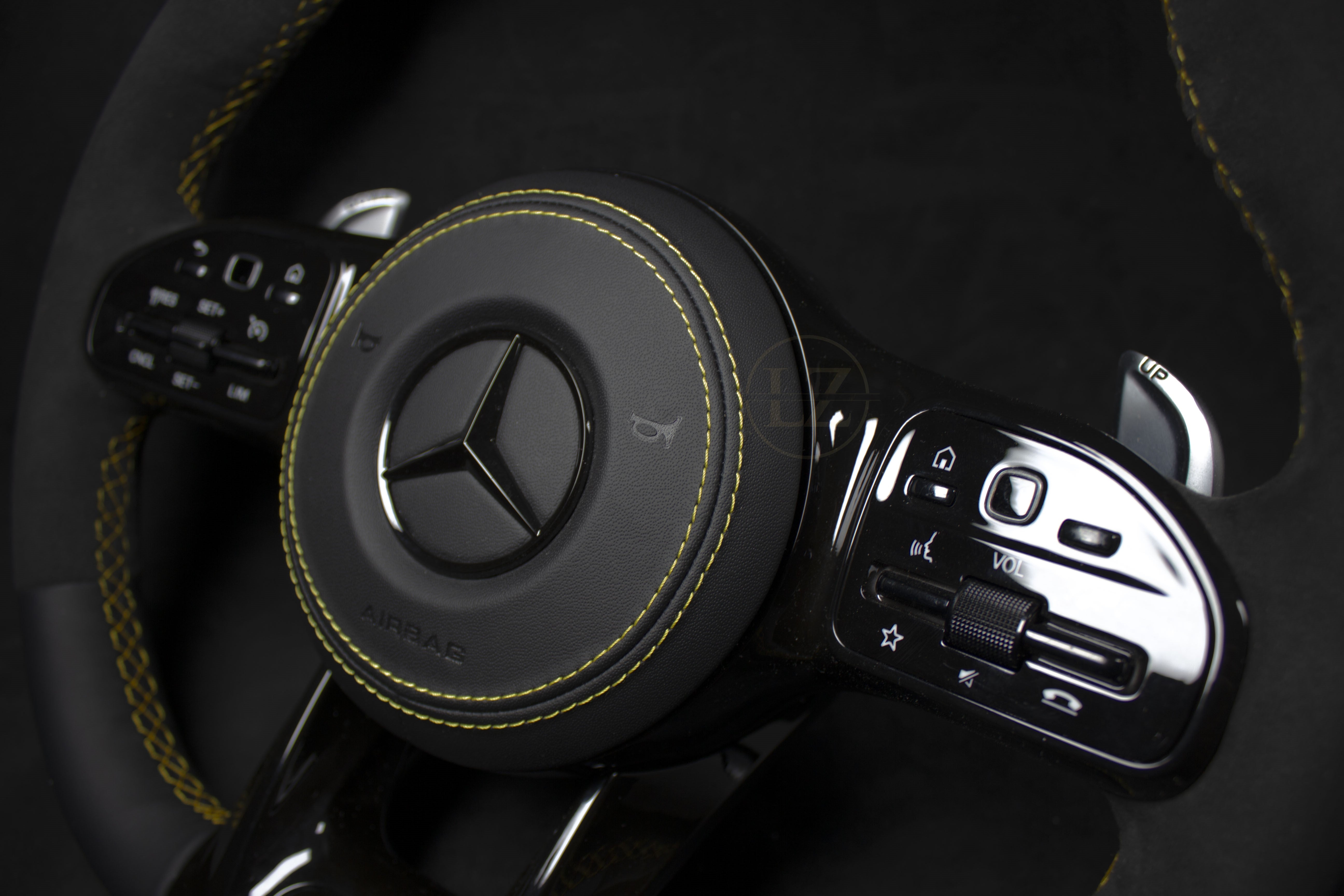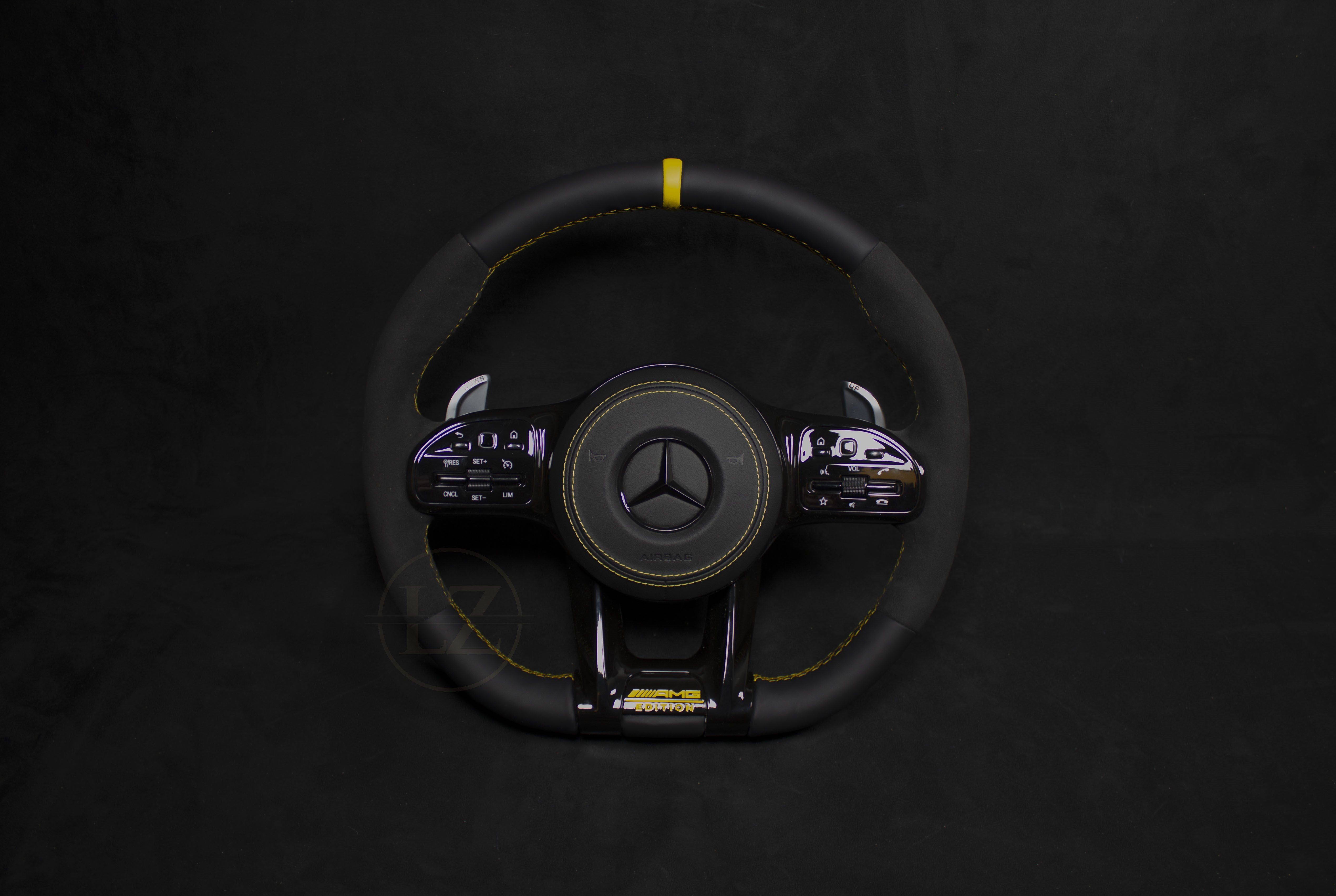 Discover the unique Mercedes-Benz C63 AMG Alcantara/Leather Steering Wheel with yellow details, a perfect combination of style and functionality. This handcrafted steering wheel is tailored for the C63 model, providing exceptional quality down to the smallest detail.