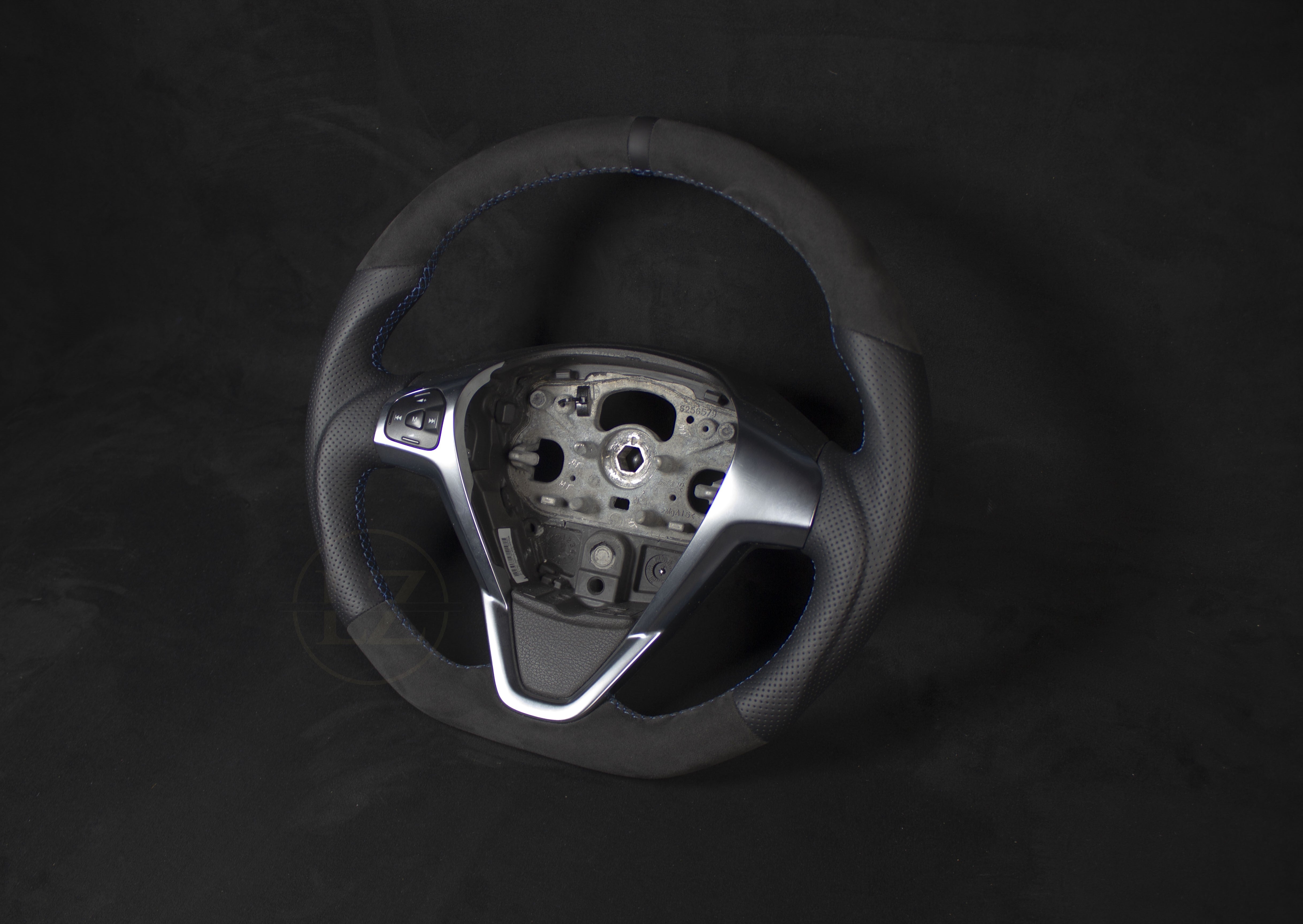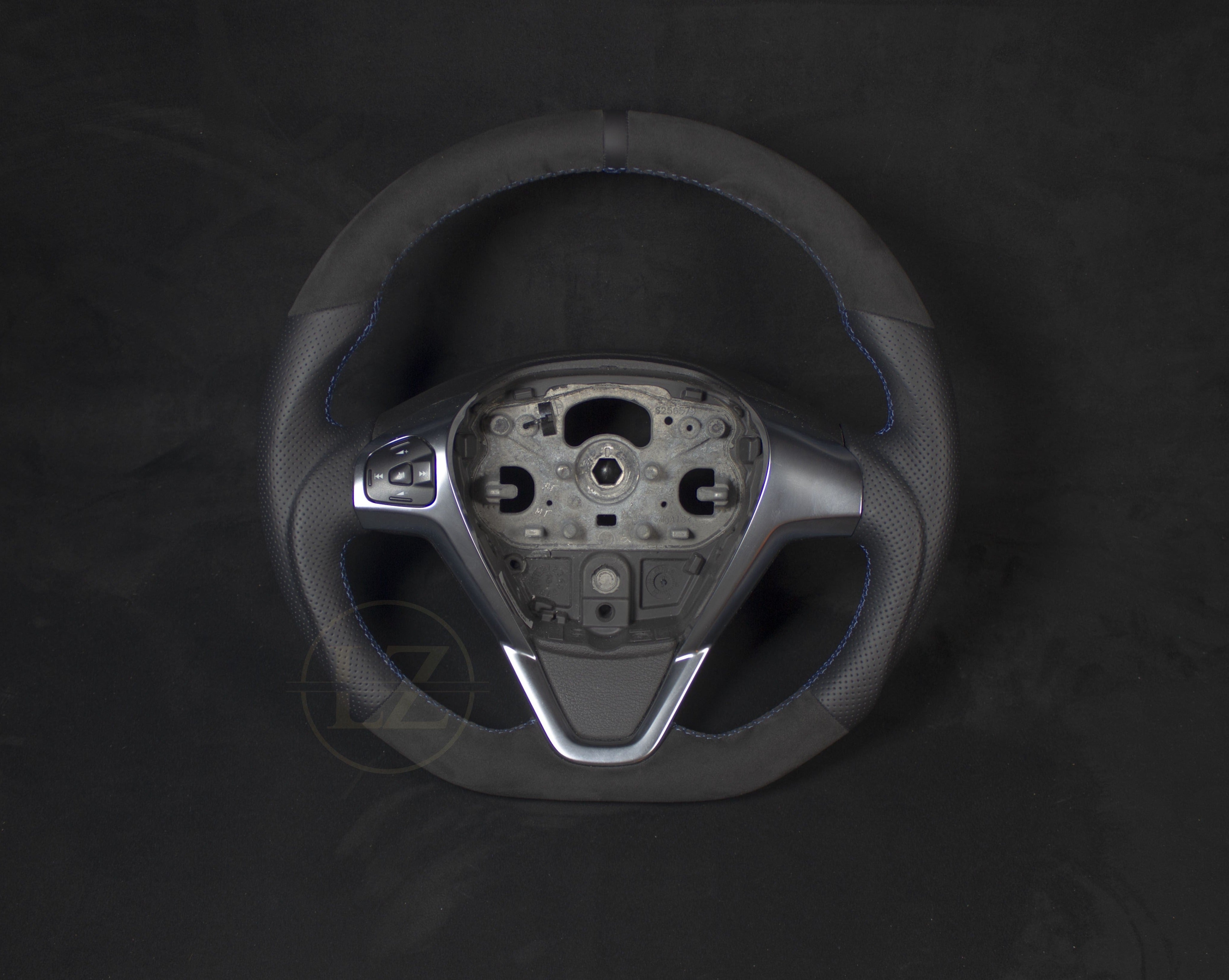 Discover the unique Ford Transit Alcantara/Leather Steering Wheel with blue details, a perfect combination of style and functionality. This handcrafted steering wheel is created with an original steering wheel base, ensuring a perfect fit without modifications.