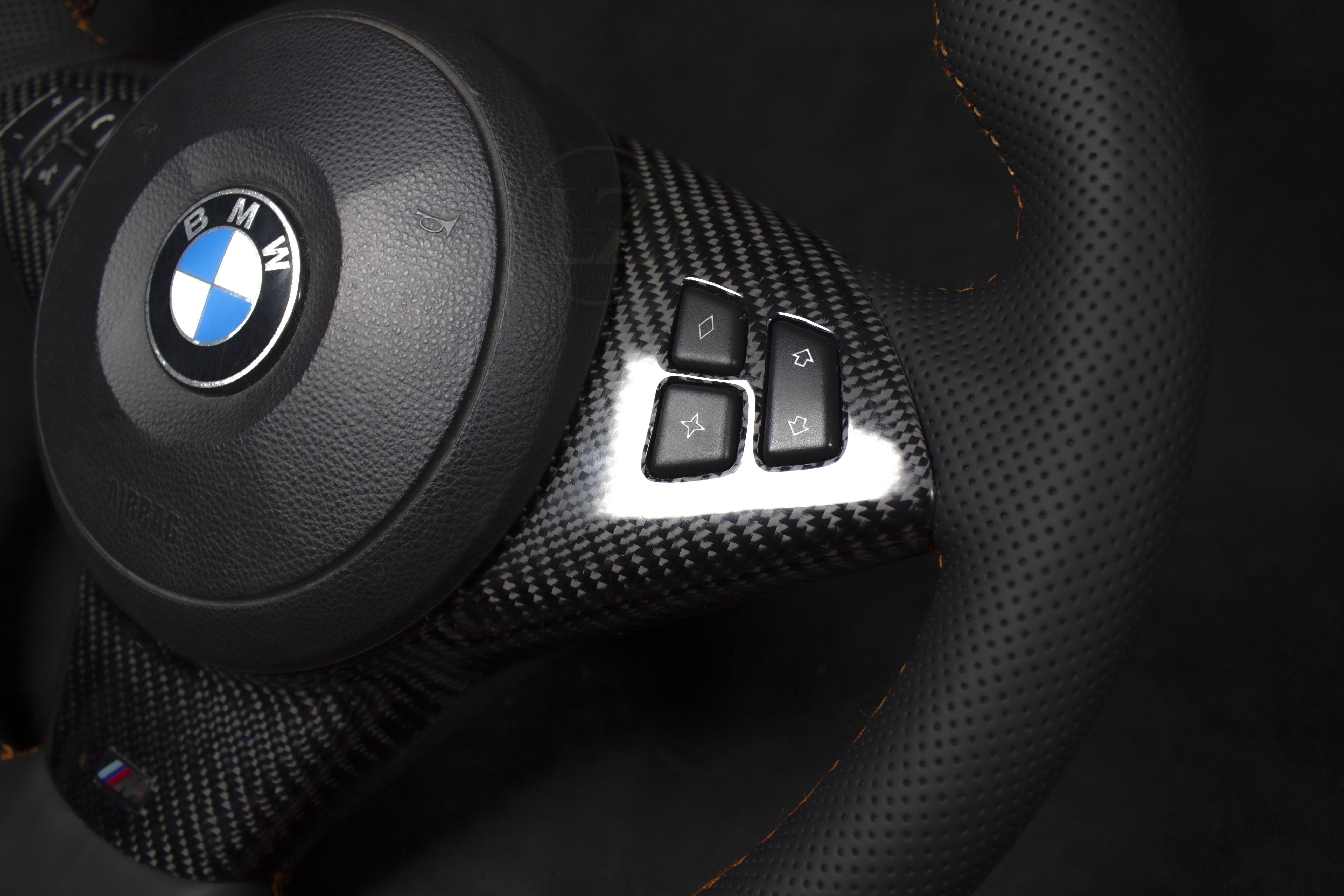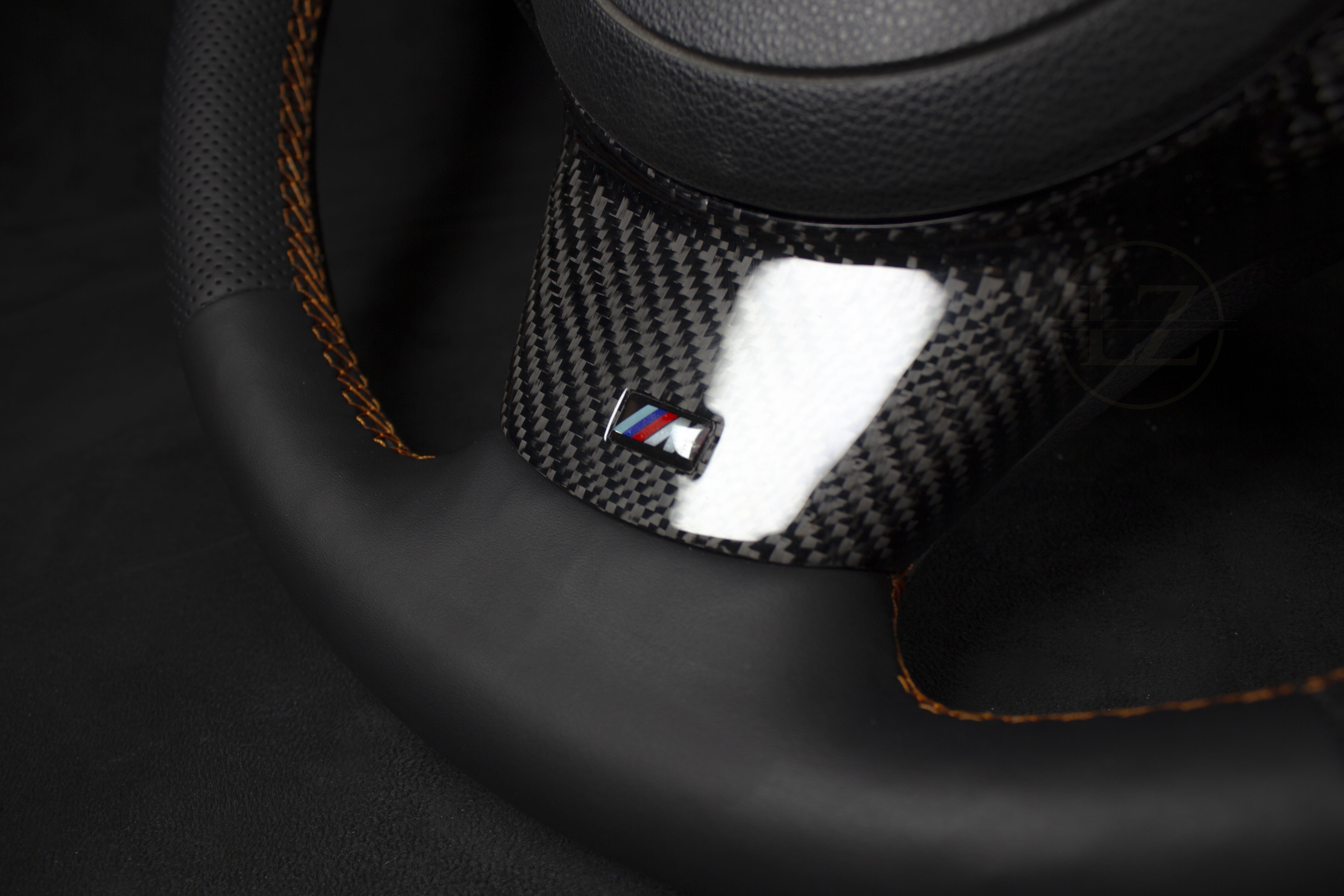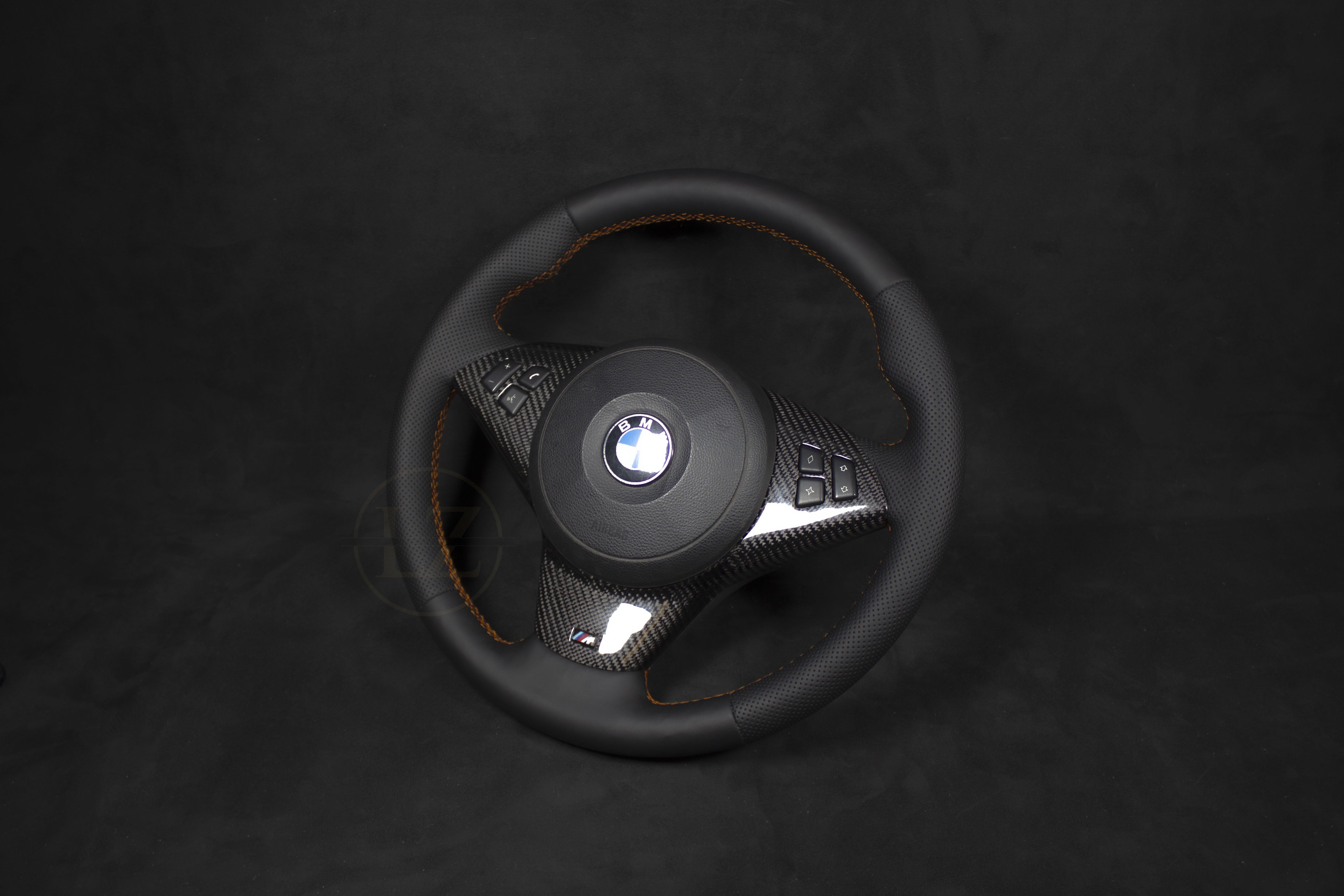 Discover the unique BMW E60, E61 Leather Steering Wheel with orange details, a perfect combination of style and functionality. This handcrafted steering wheel is tailored to fit all BMW E6X models, ensuring a perfect fit without modifications.