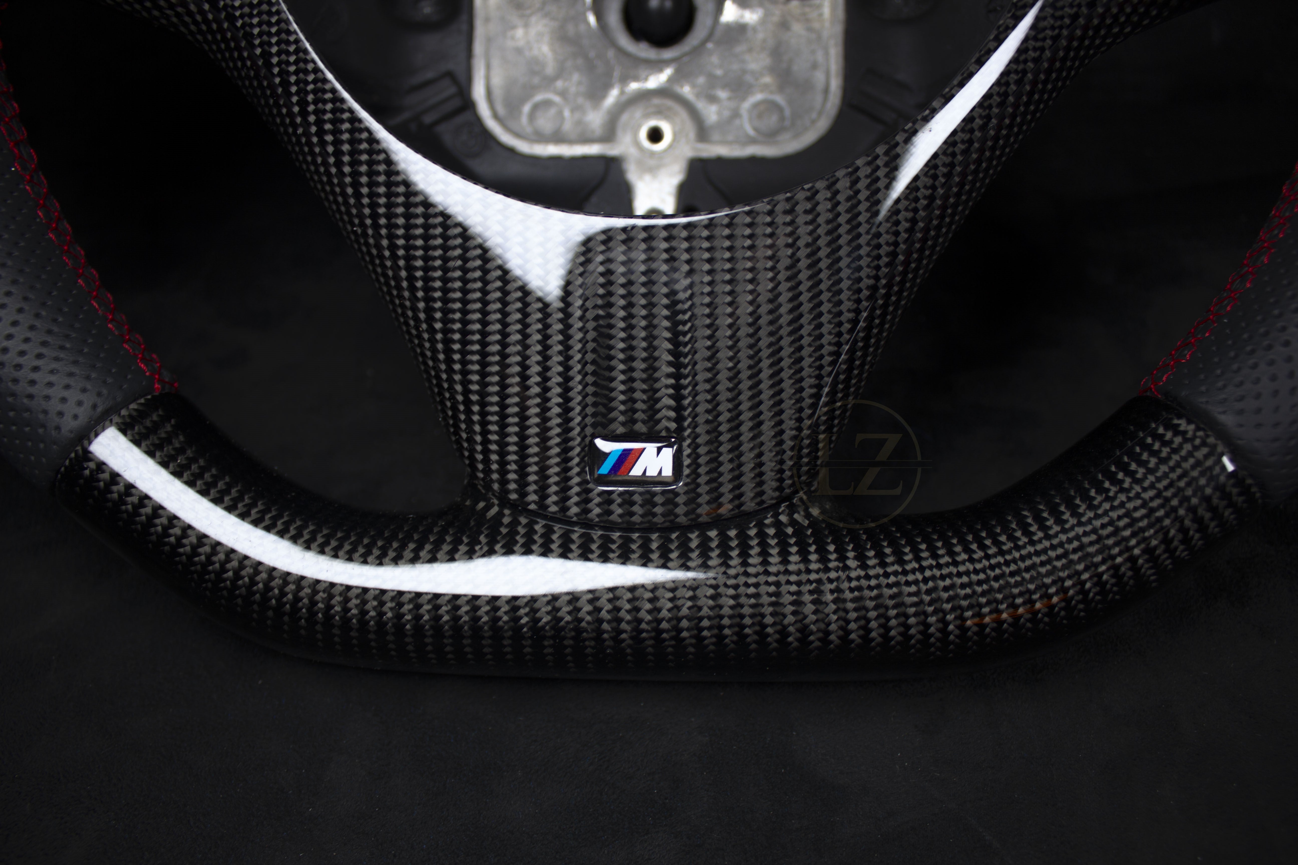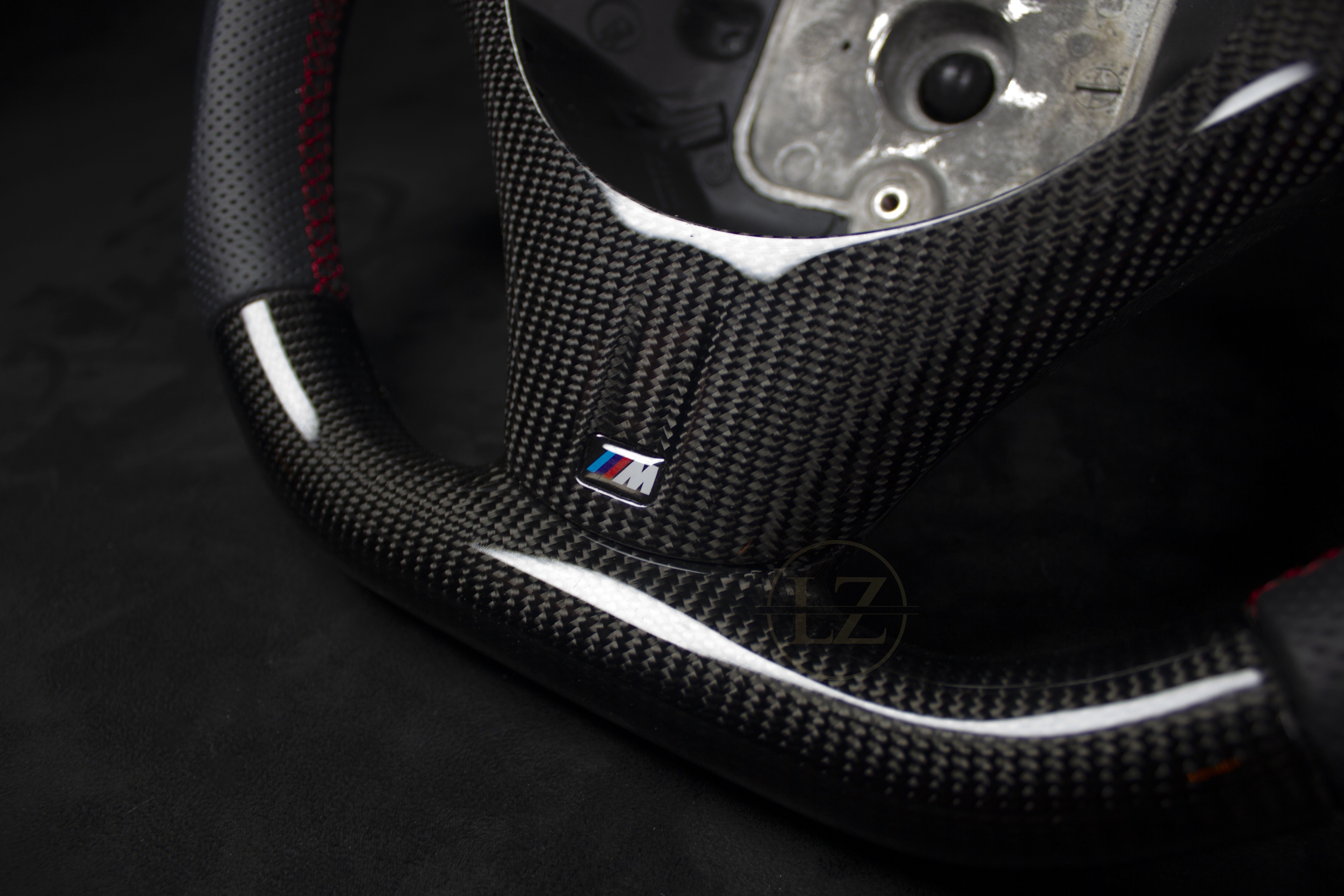 Discover the unique BMW E8X/E9X Carbon/Leather Steering Wheel with REDe details, a perfect combination of style and functionality. This handcrafted steering wheel fits all BMW E8X and E9X with M-Sport steering wheels and is designed to provide an unparalleled driving experience.