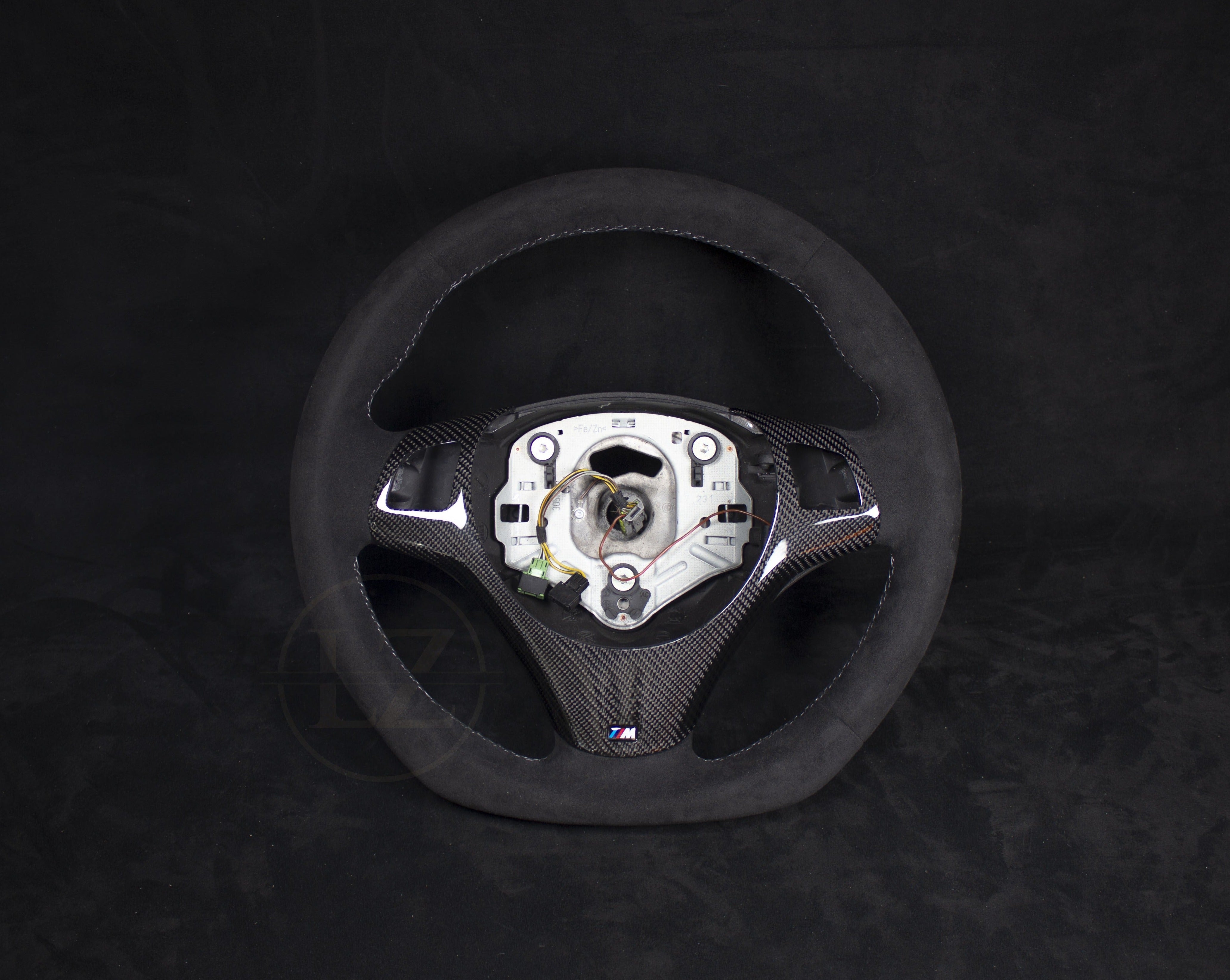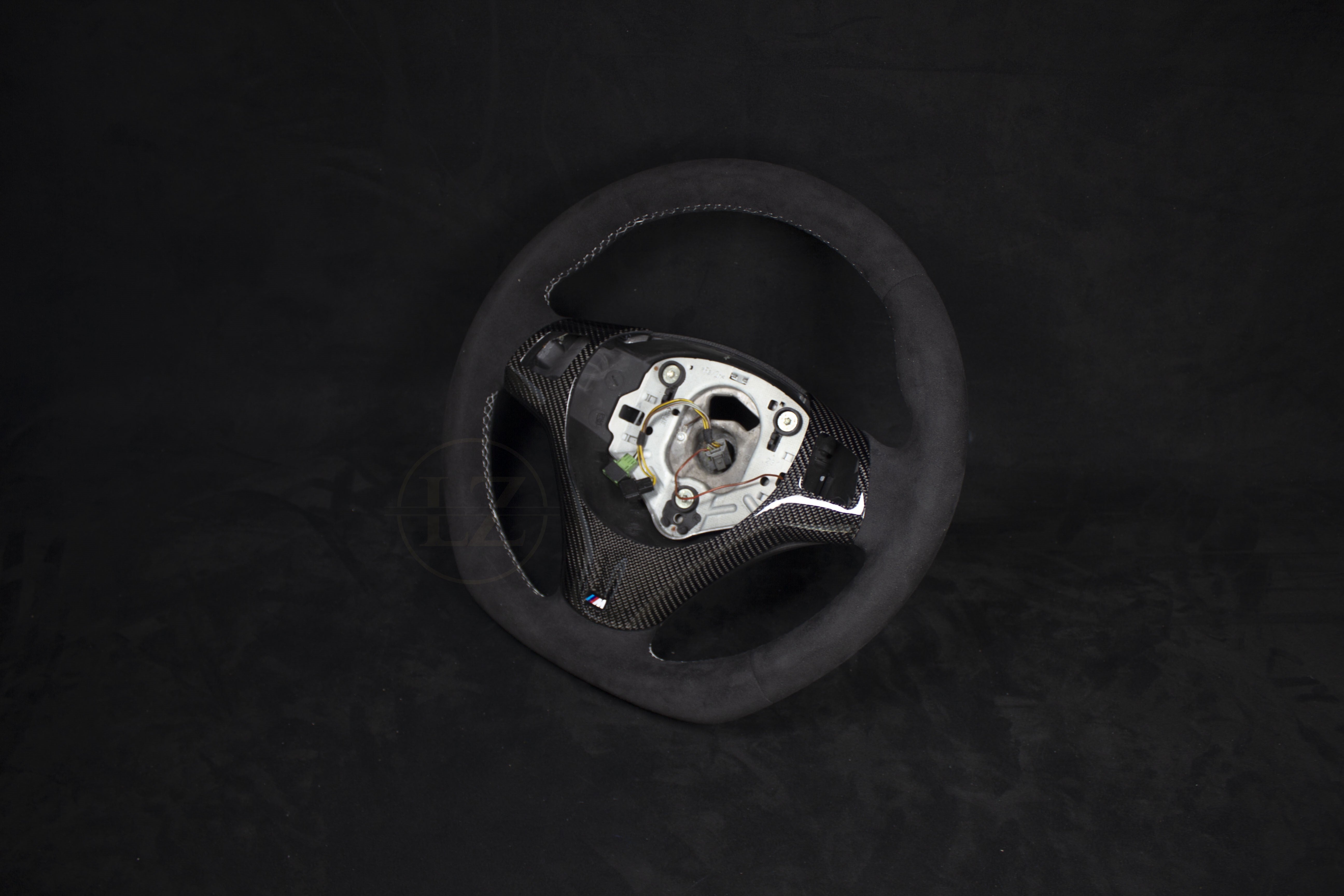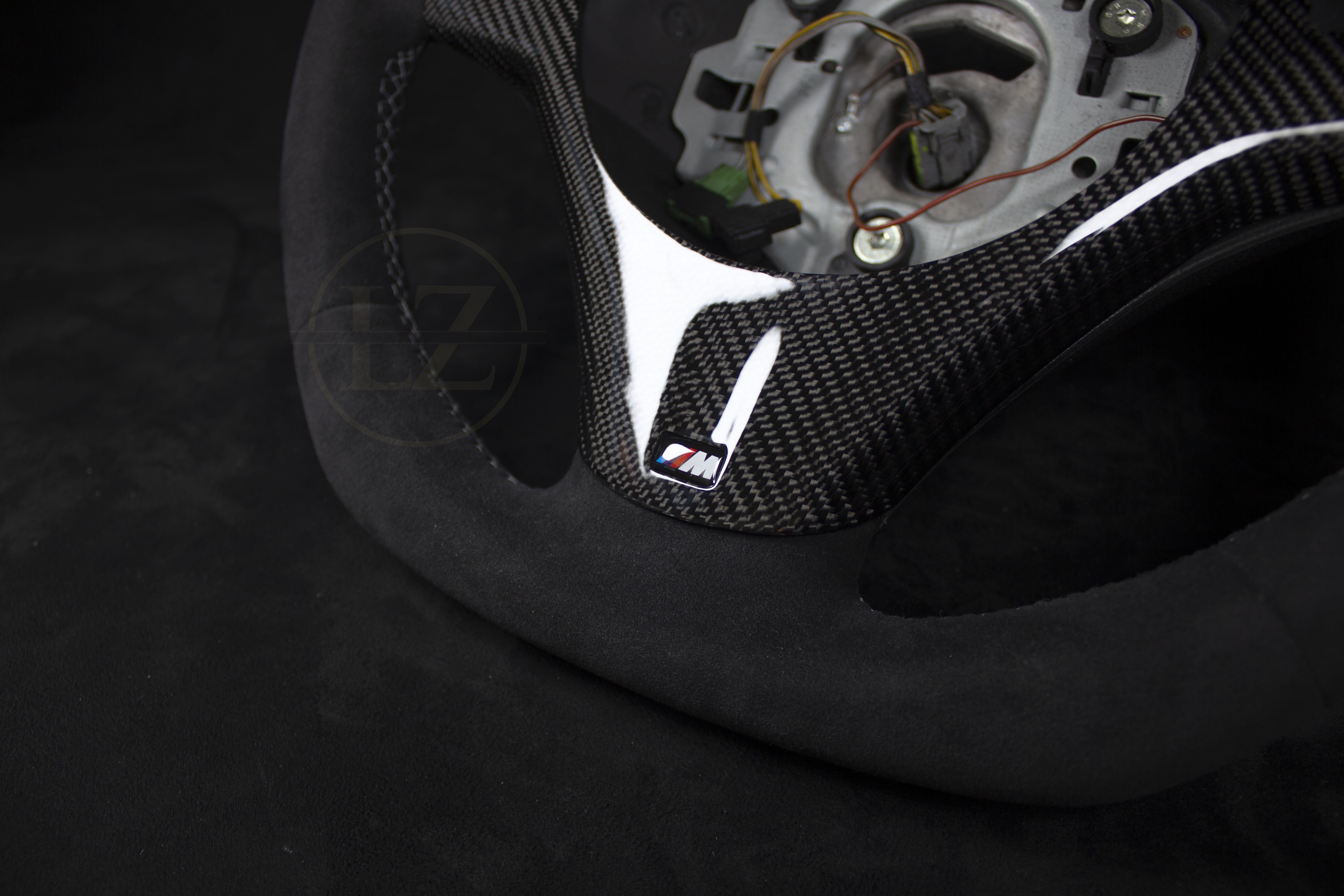 Discover the unique BMW E8X/E9X M-Performance Alcantara Steering Wheel with white stitching and carbon steering wheel cover. This handcrafted steering wheel is designed to fit perfectly on all BMW E8X and E9X models with M-Sport steering, providing exceptional quality and style.