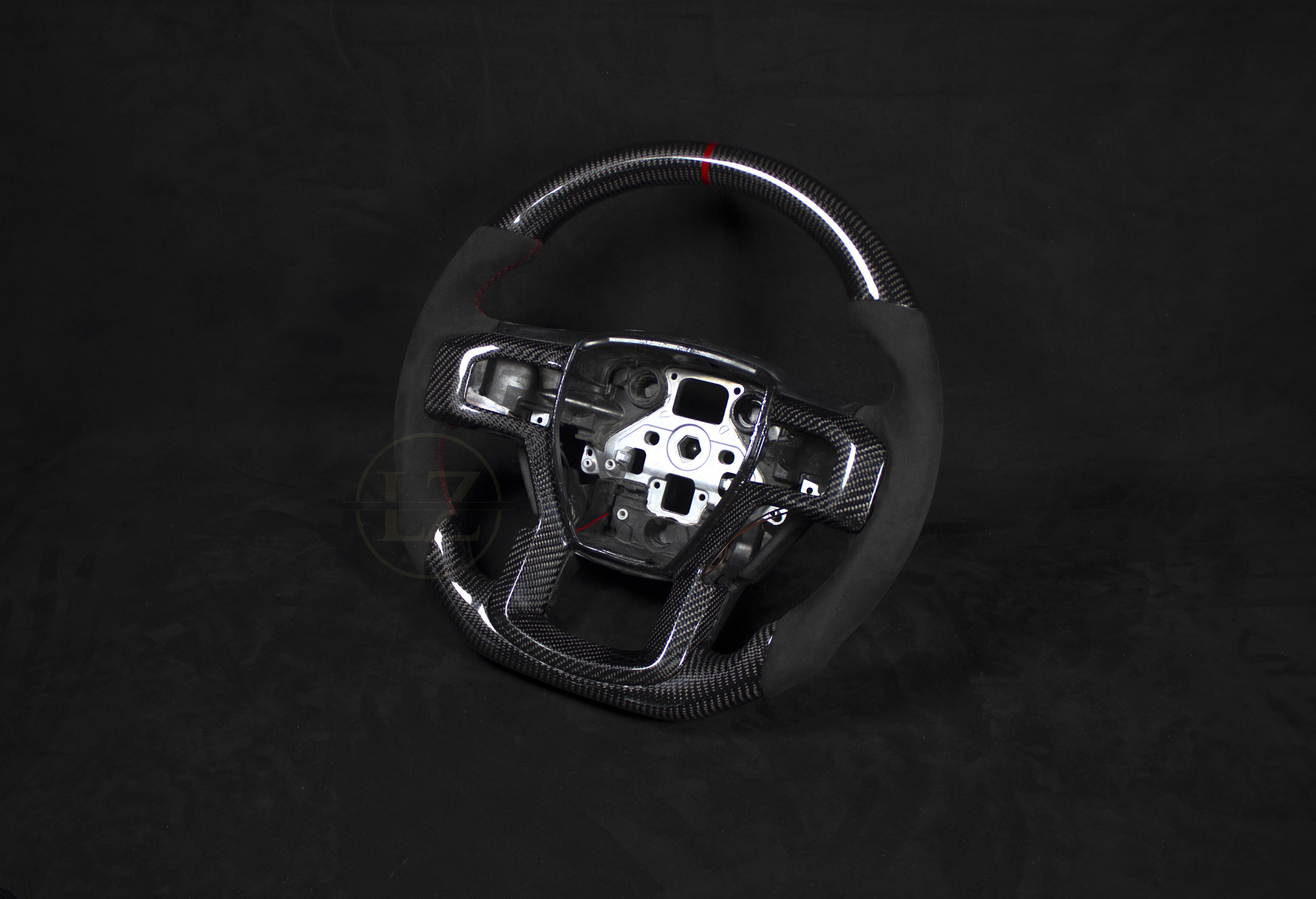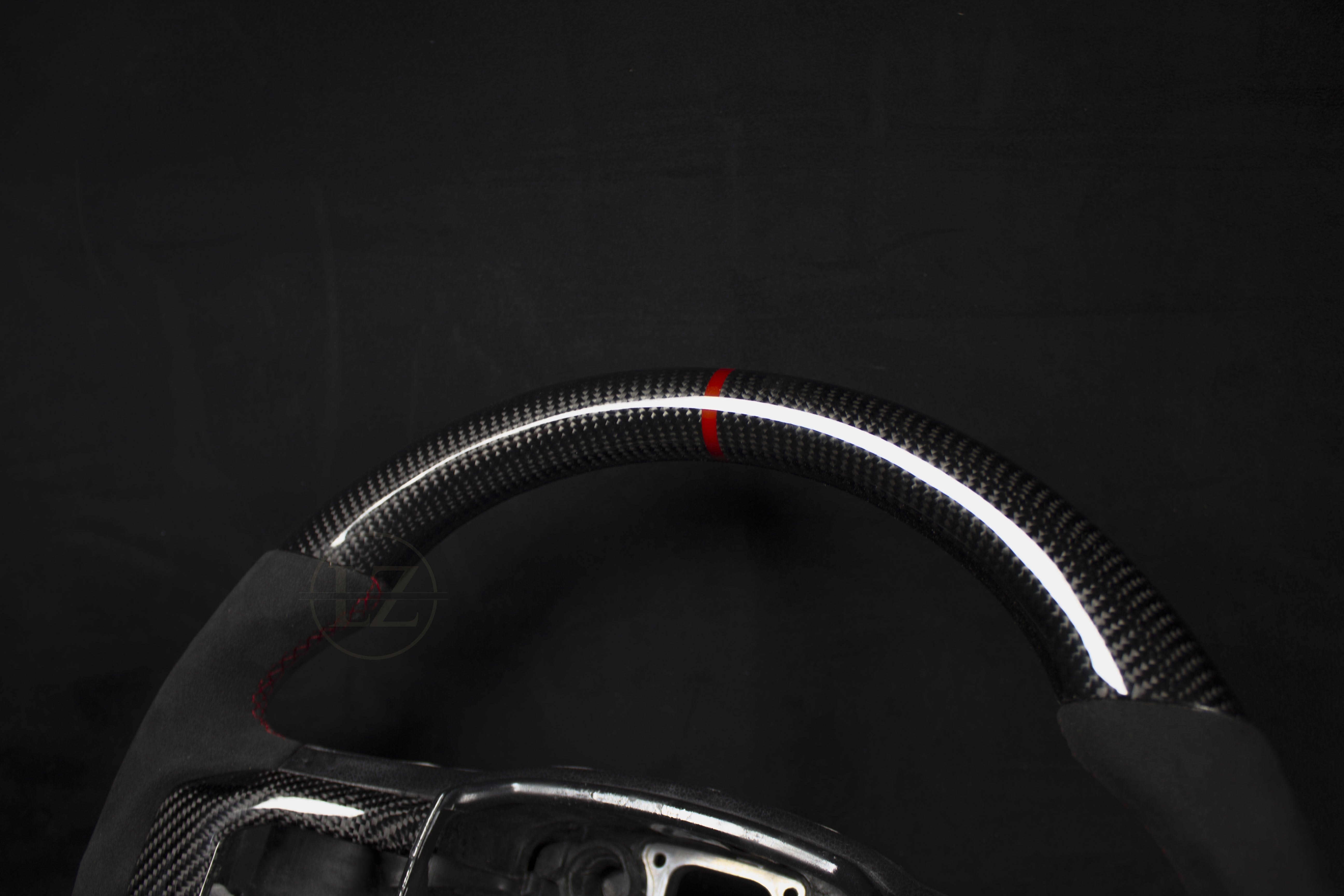 El volante está fabricado en Alcantara genuino de Alcantara. S.P.A y cuero napa italiano, con carbono importado de Japón para una máxima calidad. Con especificaciones como empuñaduras más gruesas, base plana y costuras rojas, este volante destaca entre la multitud.