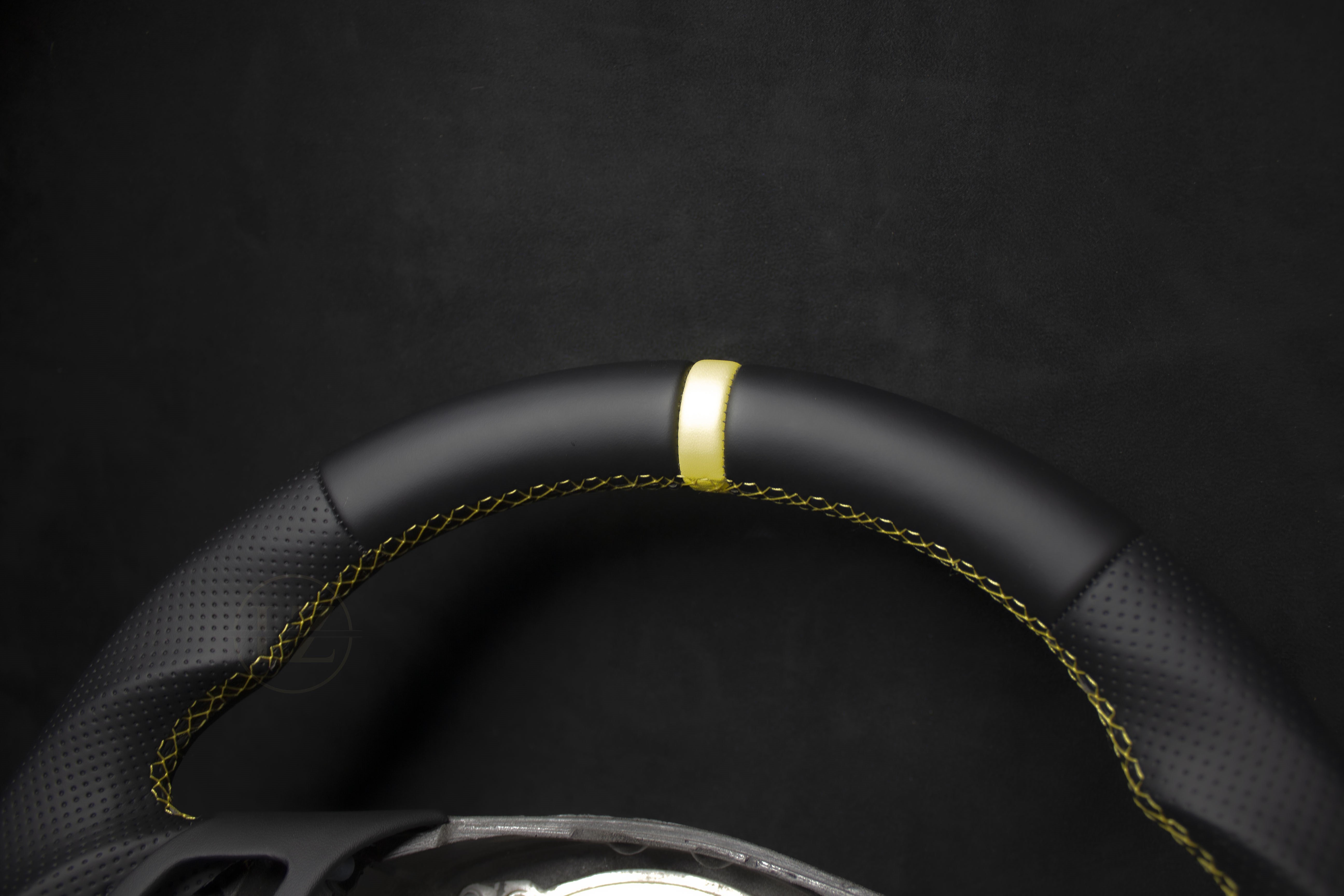 El volante está fabricado con Alcántara y Nappa genuinos de alta calidad, y el carbono importado de Japón garantiza una durabilidad excepcional. Con características como laterales de cuero perforado, franja amarilla en la parte superior y agarres más gruesos, este volante ofrece una sensación única.