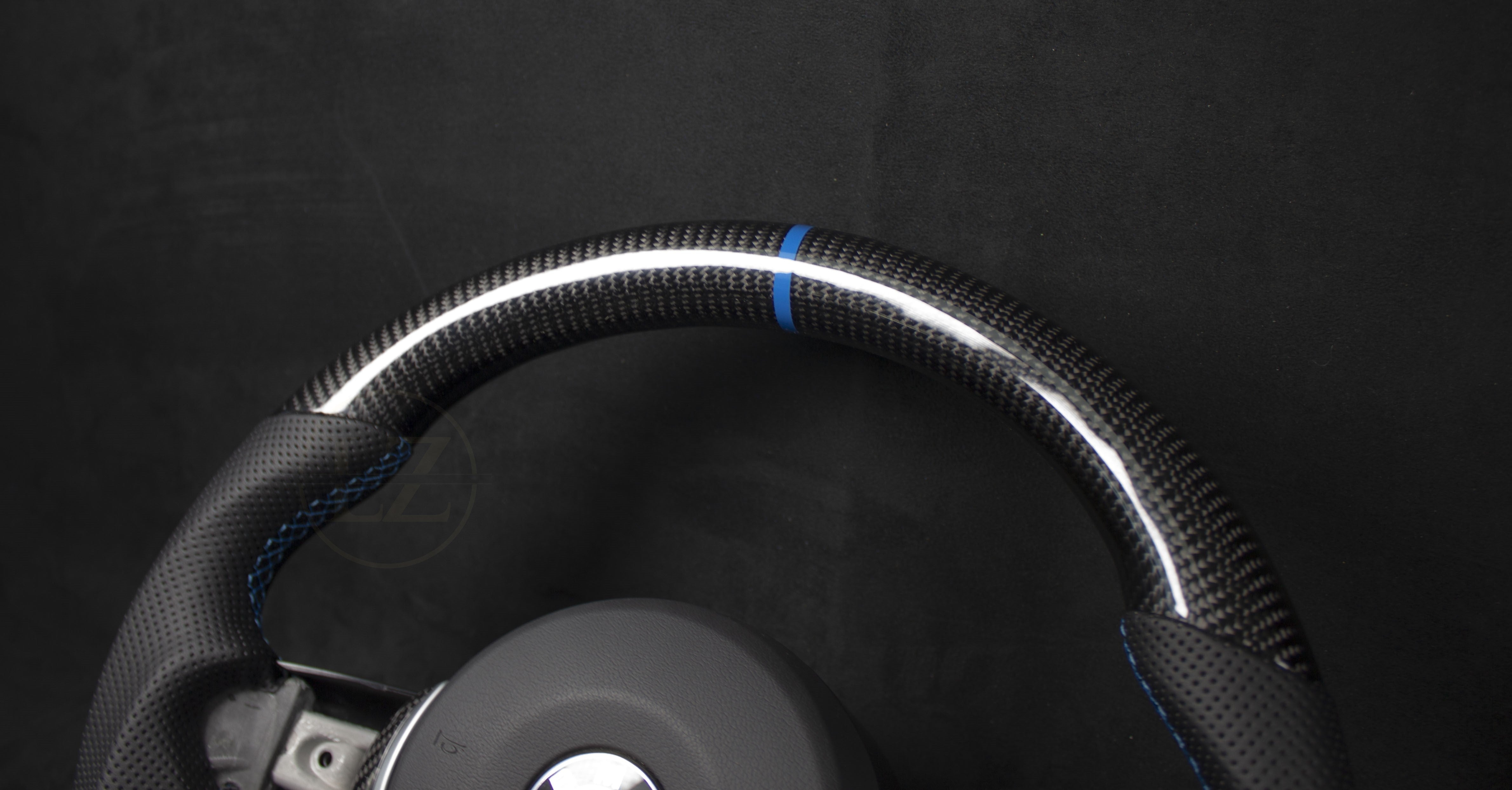 El volante está fabricado con auténtica piel Alcántara y Nappa italiana, combinada con carbono japonés para una máxima durabilidad. La base plana y los laterales más gruesos proporcionan un agarre cómodo, mientras que la franja y las costuras azules le aportan un toque deportivo.