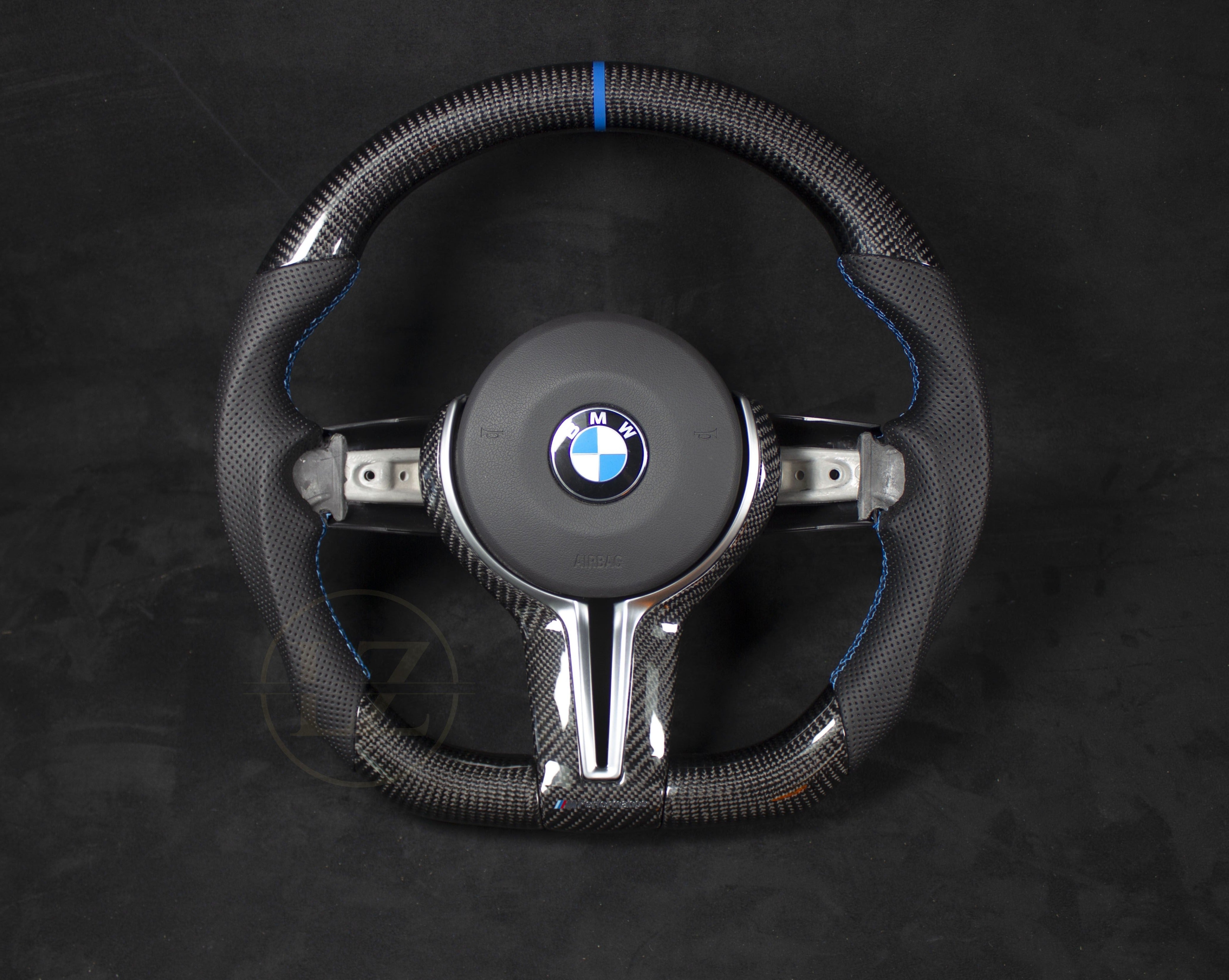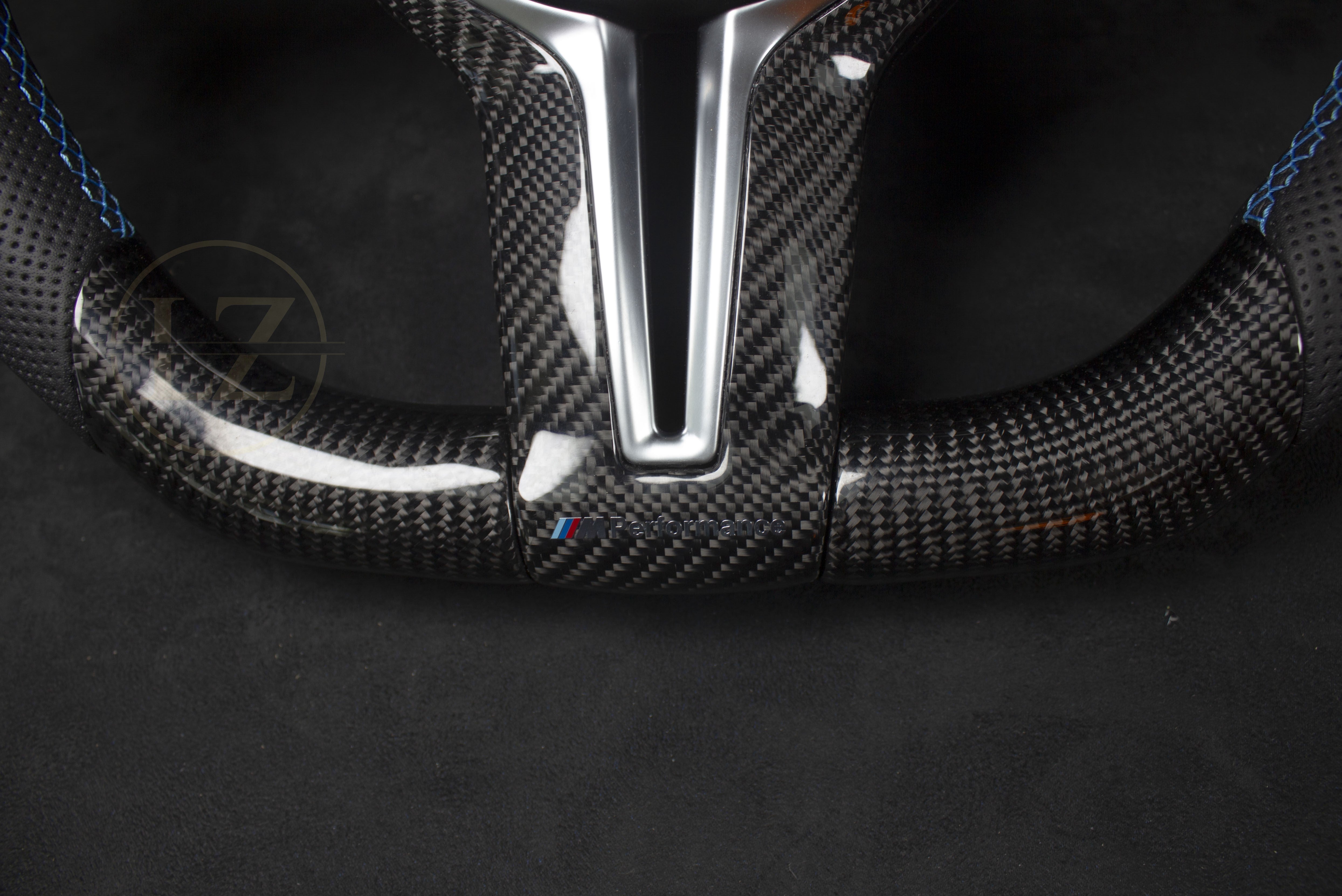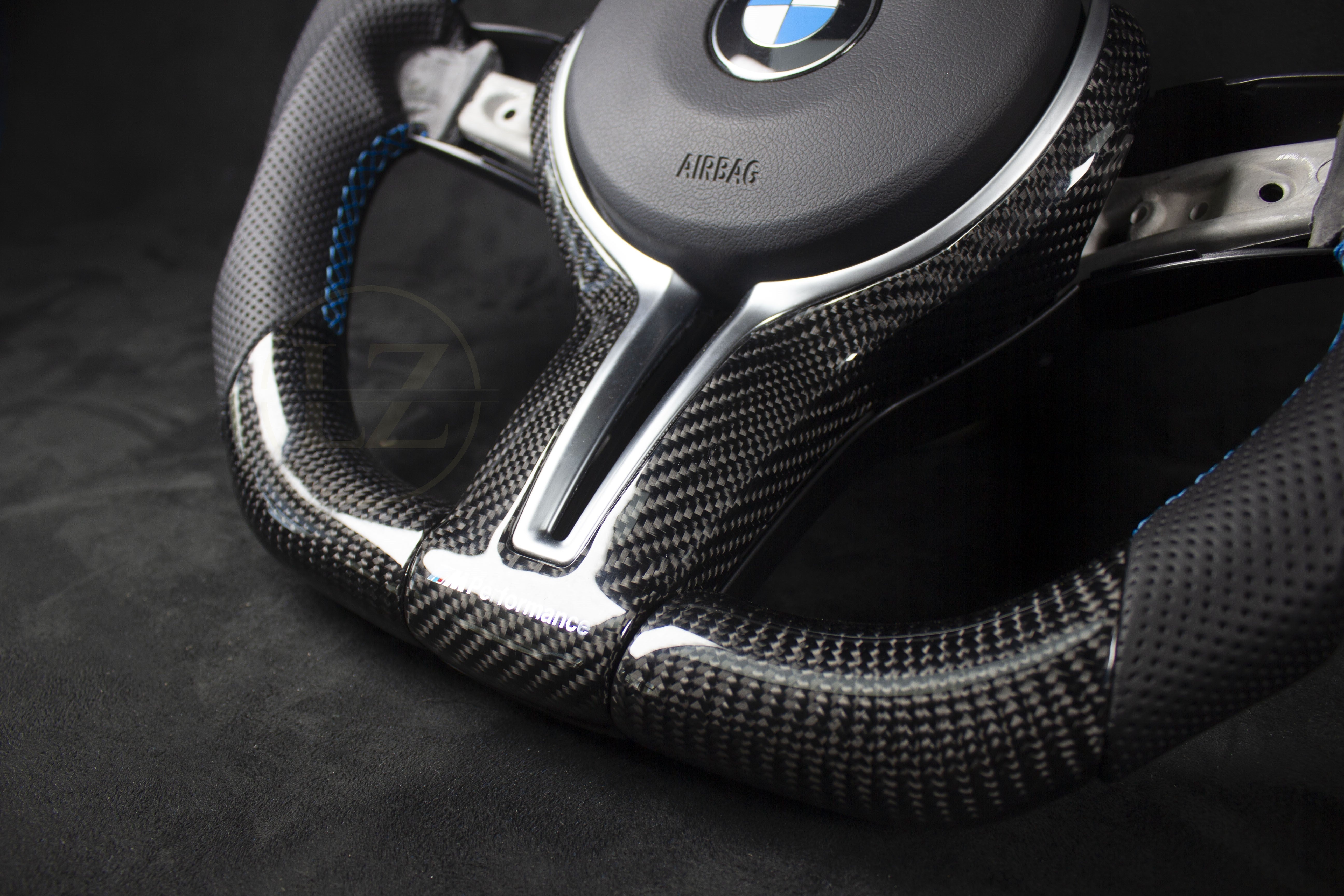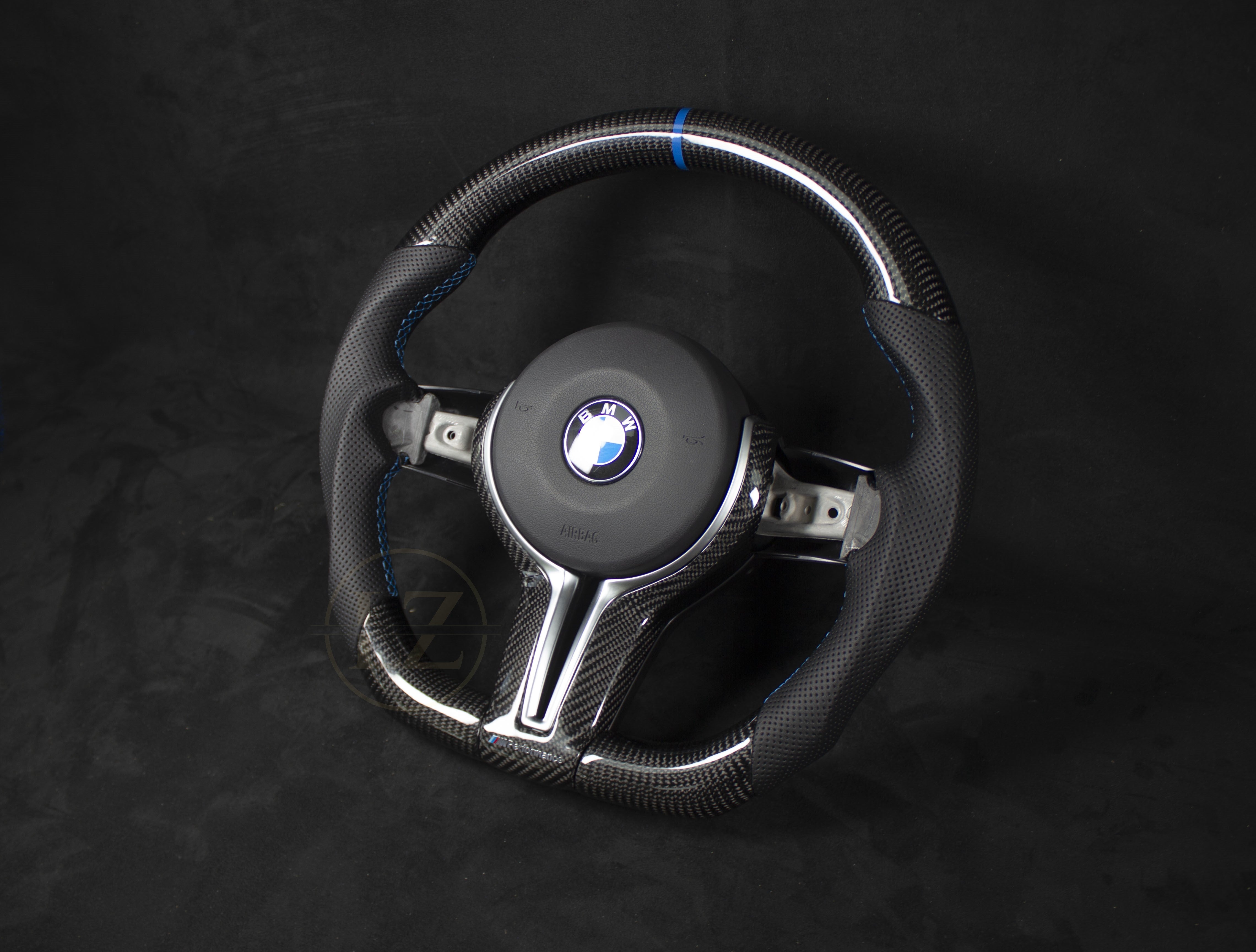 Descubra el exclusivo volante de carbono/cuero para BMW Serie F con detalles en azul, diseñado para mejorar su experiencia de conducción. Este volante artesanal se adapta perfectamente a todos los BMW F2X, 3X y 8X con volante M-Sport, ofreciendo una calidad y un estilo inigualables.