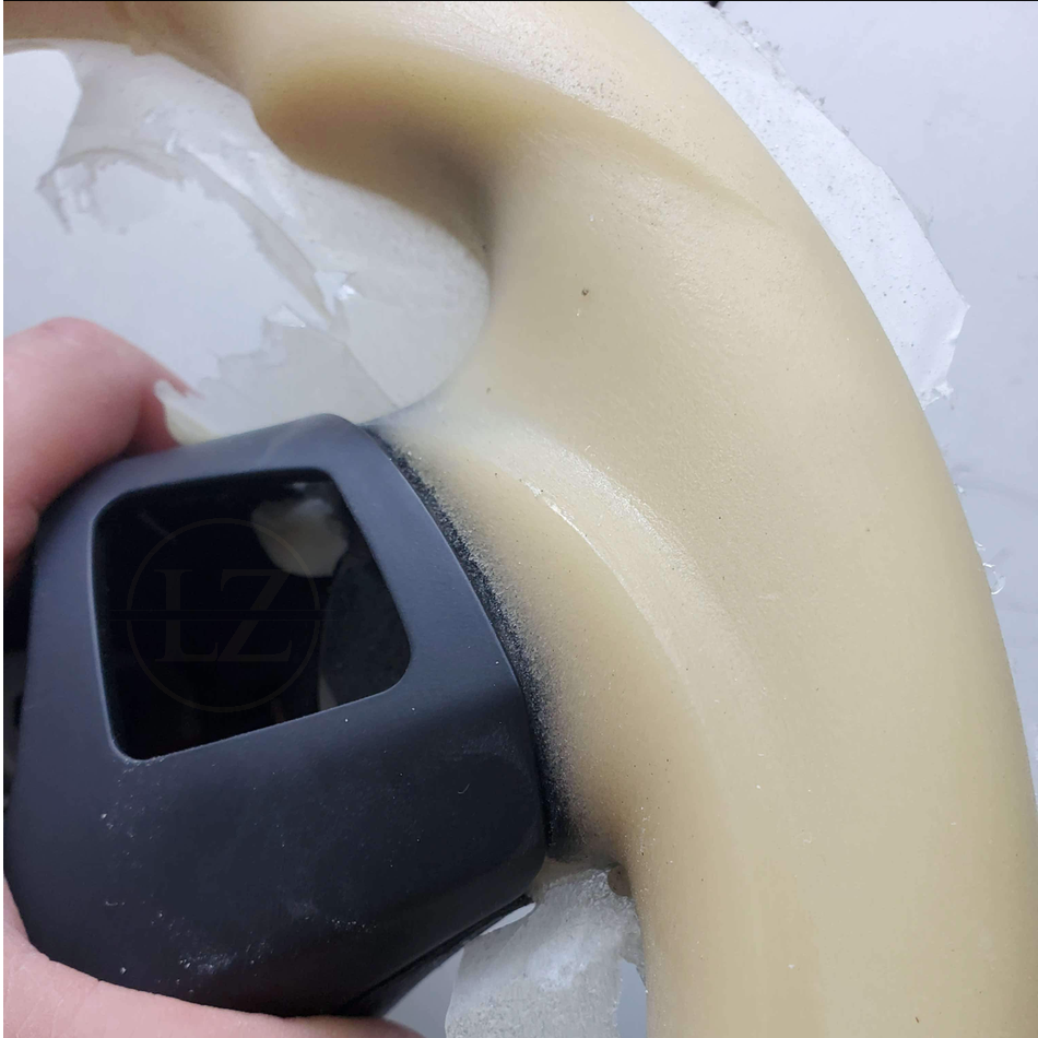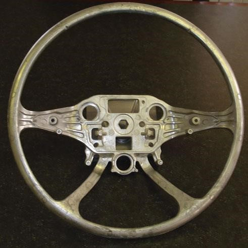 Il nous reste maintenant la base et la tige de fer qui épouse la forme du volant. Le volant est placé dans un moule qui lui donne sa forme. Ce moule utilise du polyuréthane, le même matériau que celui utilisé pour les garnitures automobiles de haute qualité. Deux étapes de moulage sont nécessaires : moulage, nettoyage, apprêt et moulage.