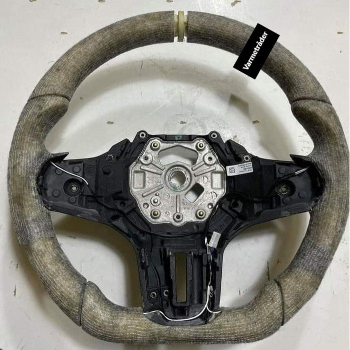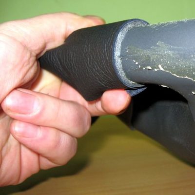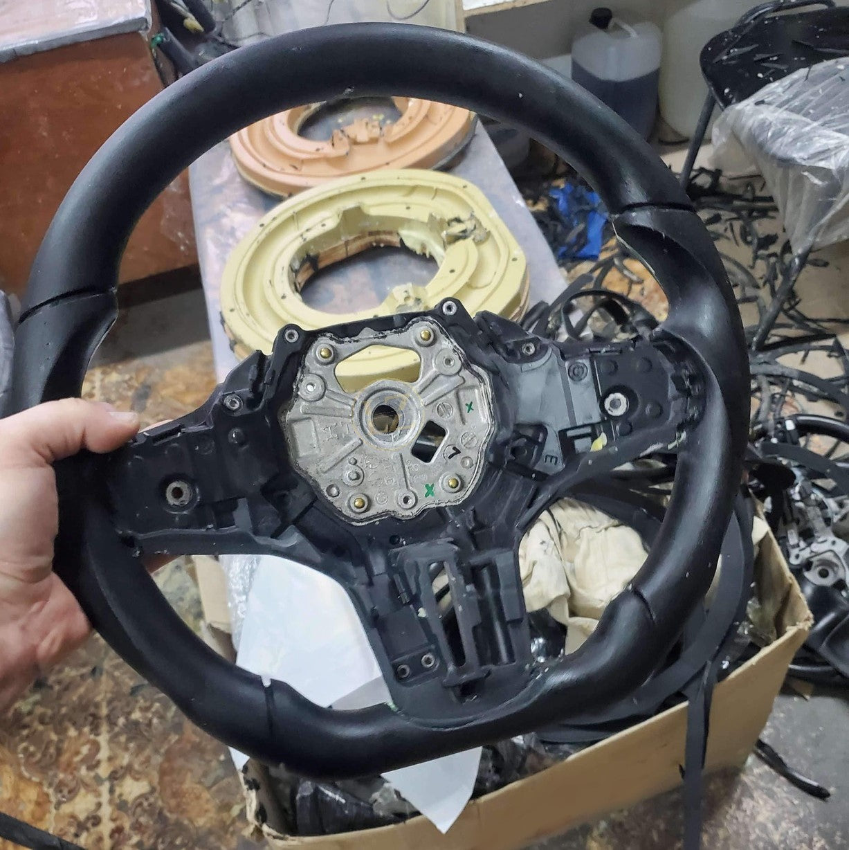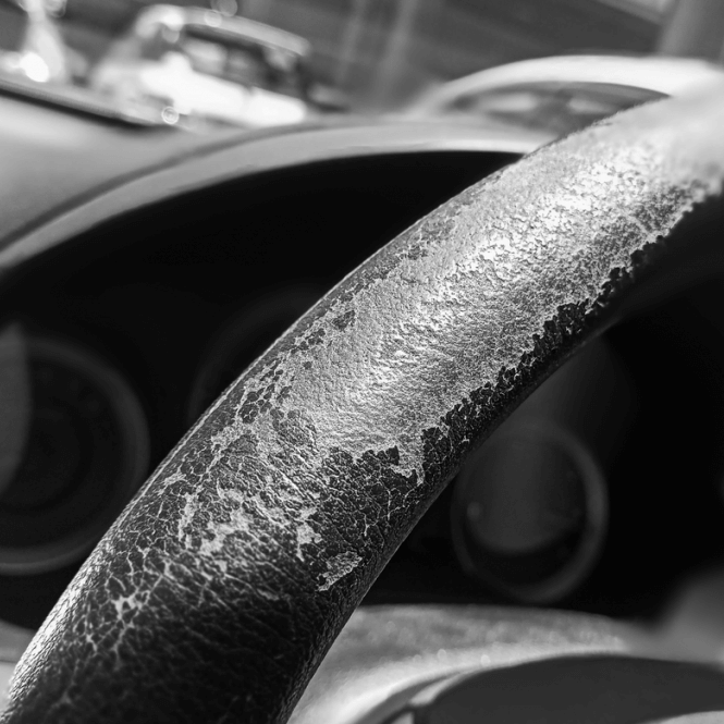 Une fois le volant vérifié et conforme au contrôle de sécurité, nous pouvons commencer. Nous retirons l'ancien cuir, la colle et le rembourrage en dessous. La plupart des volants sont constitués d'une tige de fer au milieu et d'un composite vinyle pigmenté ou caoutchouc/plastique. Nous retirons également ce matériau.