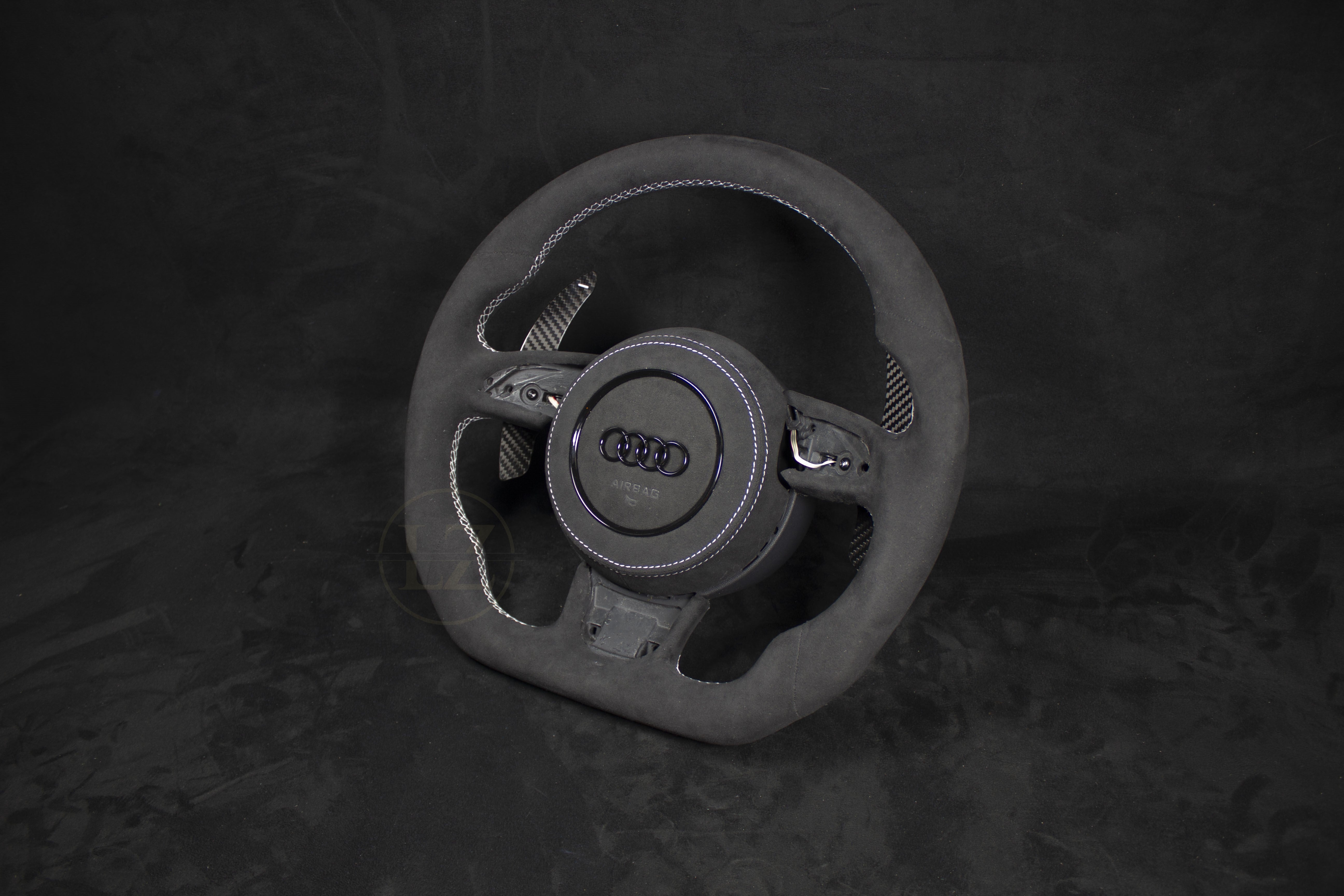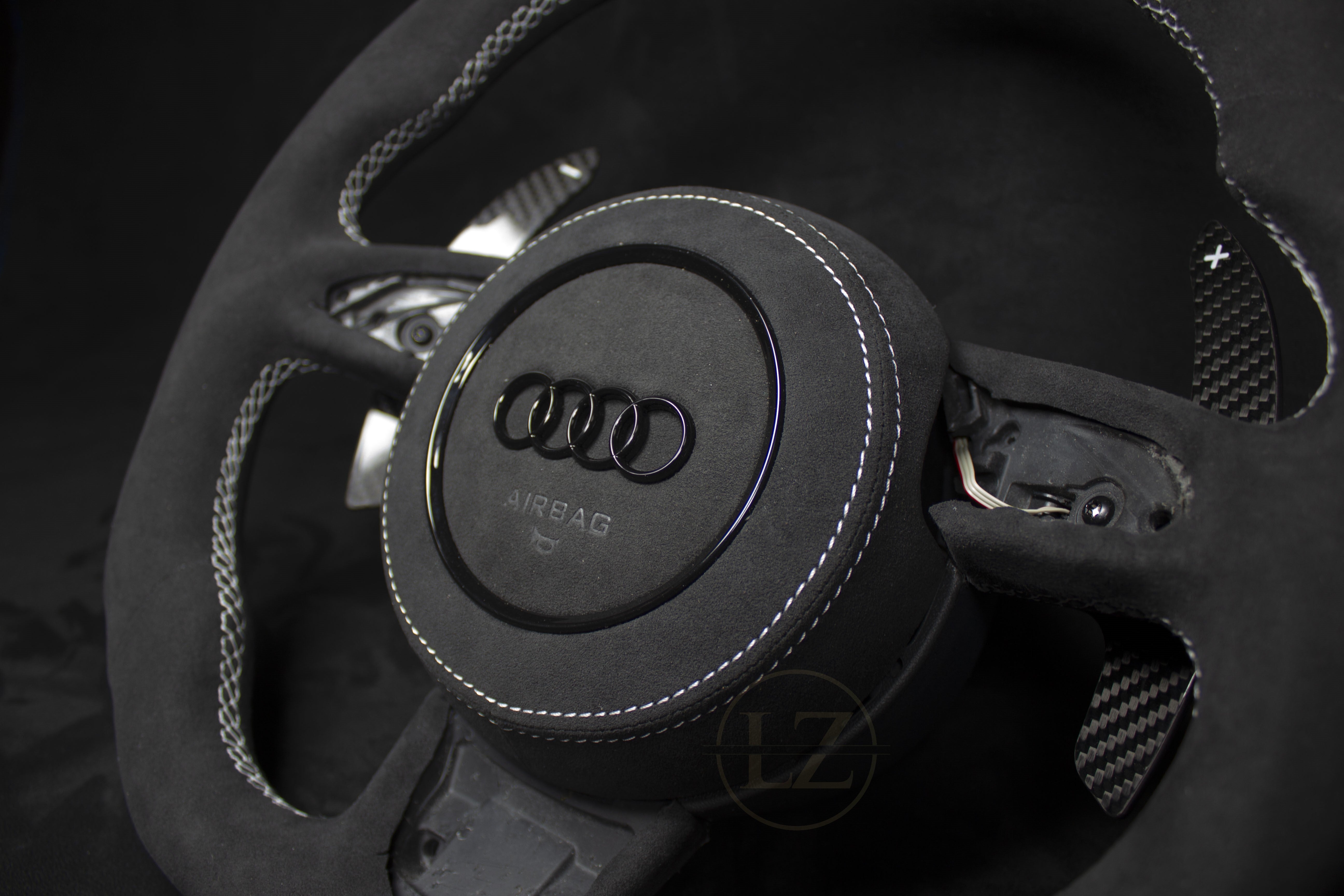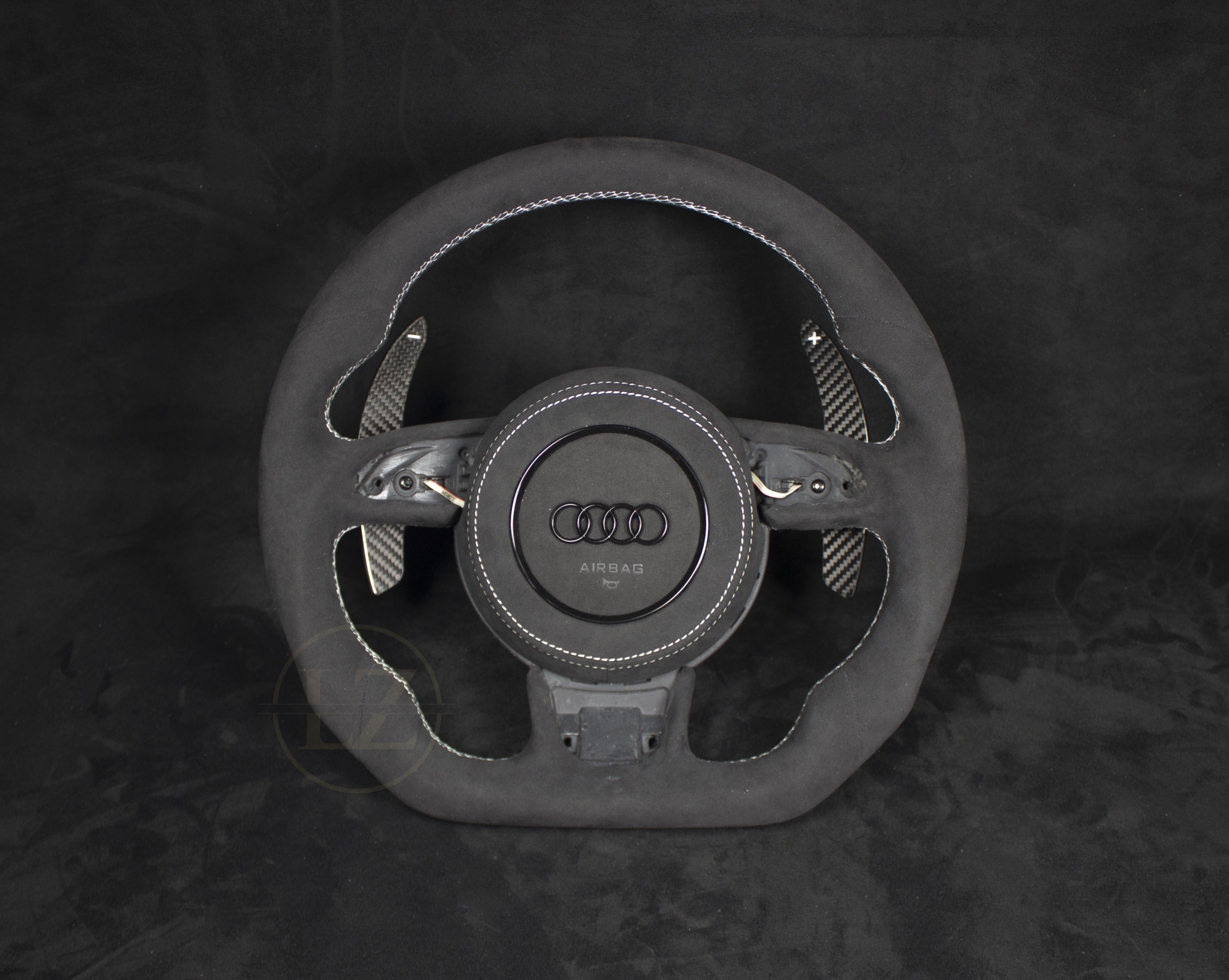 Découvrez le volant unique Audi B8 Alcantara avec détails blancs, un bijou fait main qui donne à votre voiture une touche exclusive.