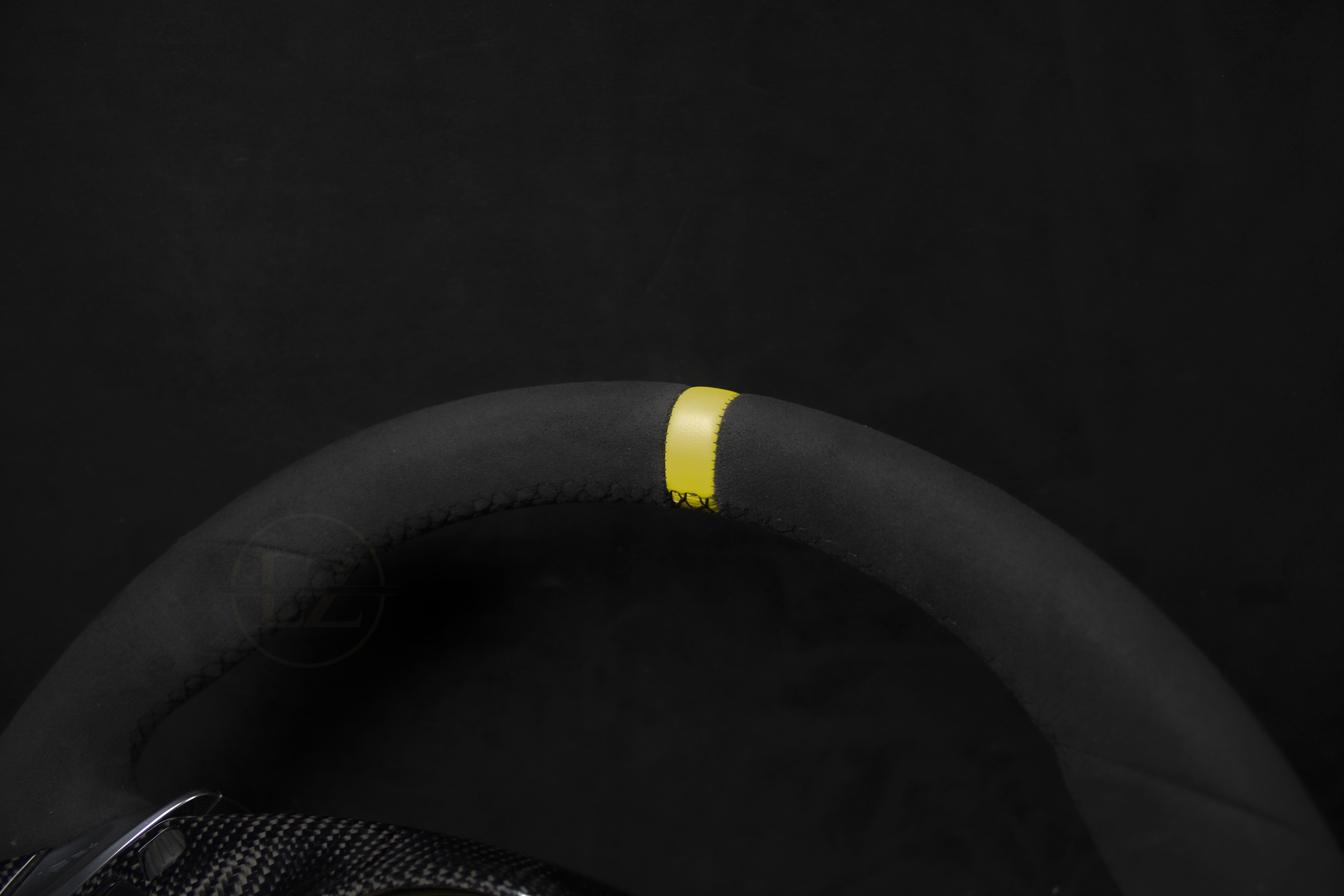 Personnalisez le volant avec une bande jaune sur le dessus et des surpiqûres noires, ou choisissez des poignées plus épaisses et un couvre-volant en carbone pour une touche personnelle. Le délai de livraison est d'environ 6 à 7 semaines, et le volant est livré avec tous les composants nécessaires pour une installation facile.