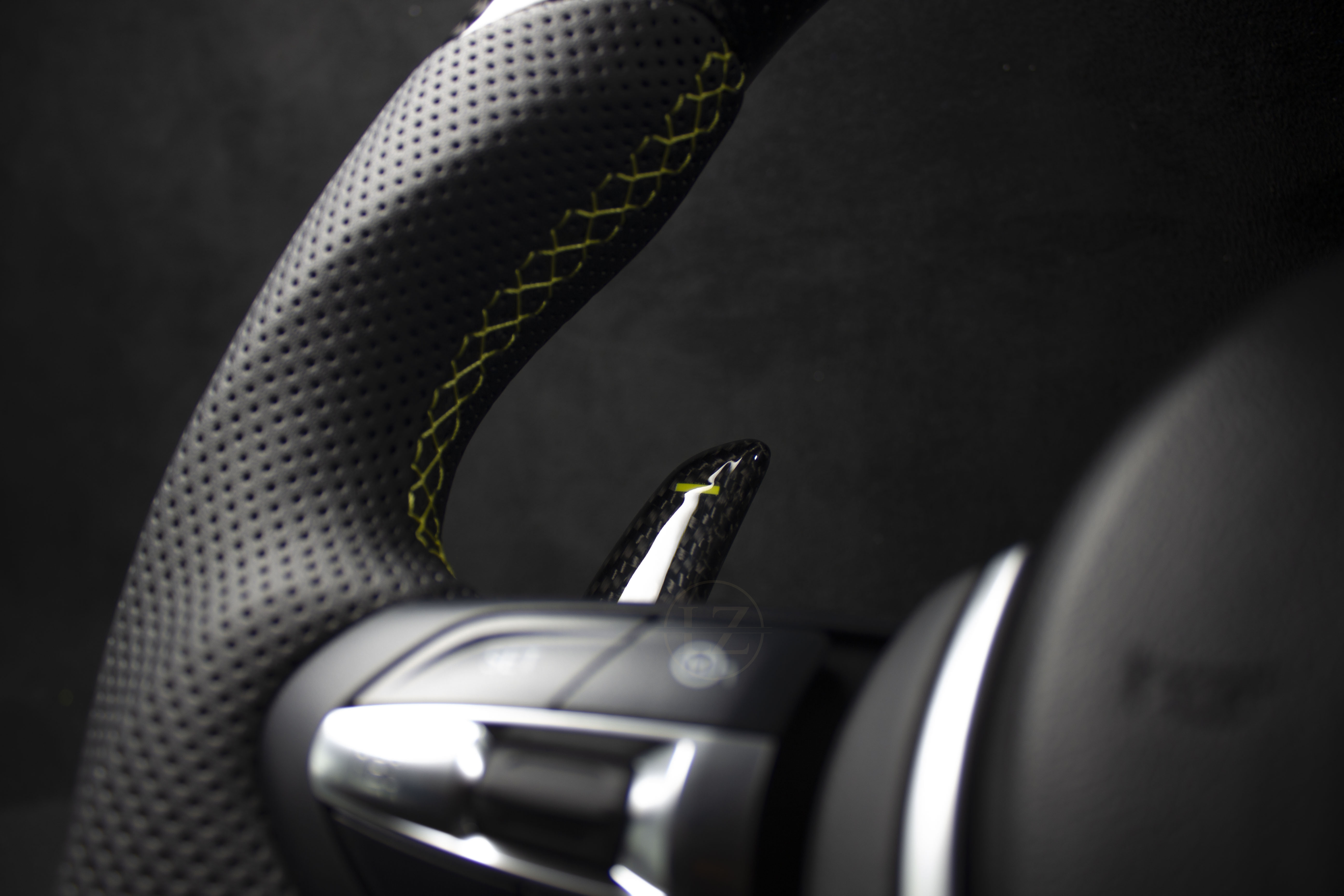 Rattet er laget med ekte Alcantara og Nappa skinn, kombinert med karbon fra Japan for maksimal holdbarhet. Den perforerte huden, den flate bunnen og de gule sømmene gir et sporty preg, mens den tykkere polstringen sikrer et komfortabelt grep.